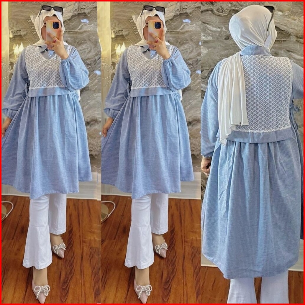 Vallina Outfit - Sabira Tunik Atasan Wanita Muslim All Size Fit To Xl Besar Matt Katun Salur Premium Ootd Casual Daily