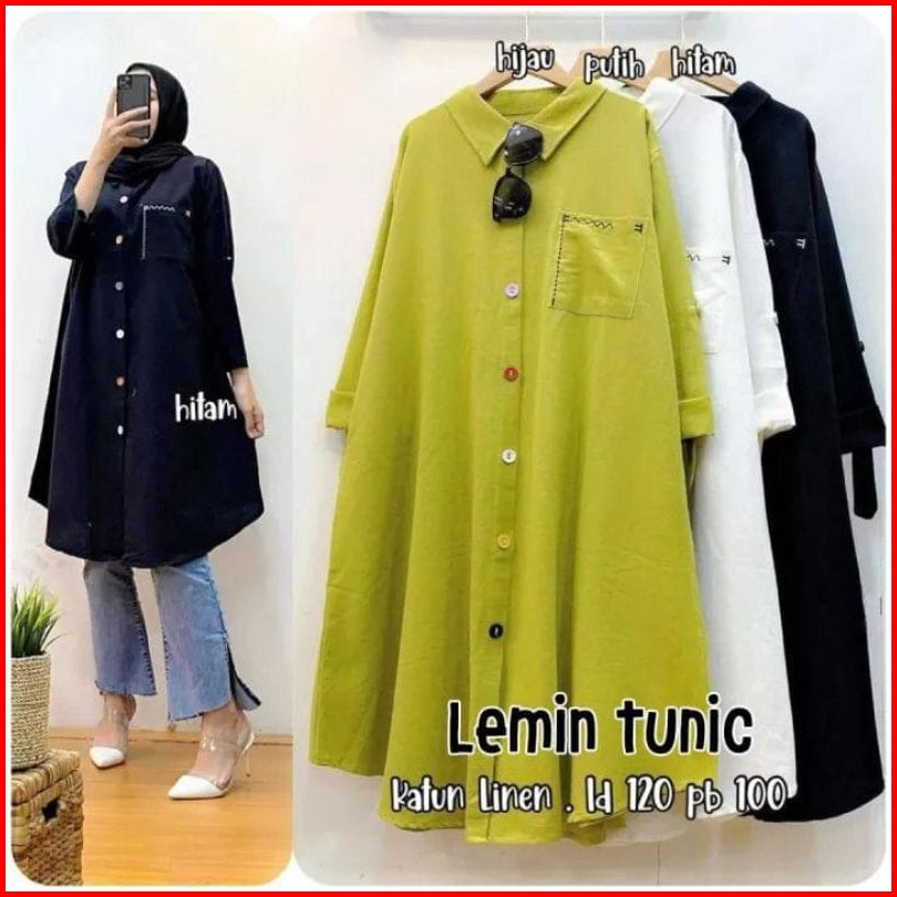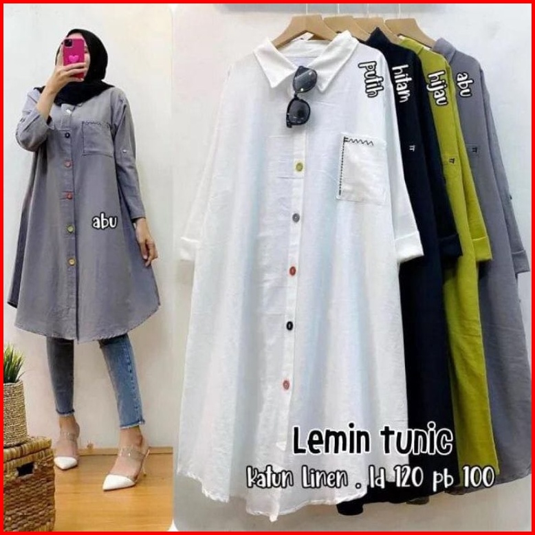 Tunik Katun Linen Model Kekinian Terlaris Ld 110 - 120 Dengan Motif Saku Bordir Atasan Wanita Dewasa Jumbo Full Kancing