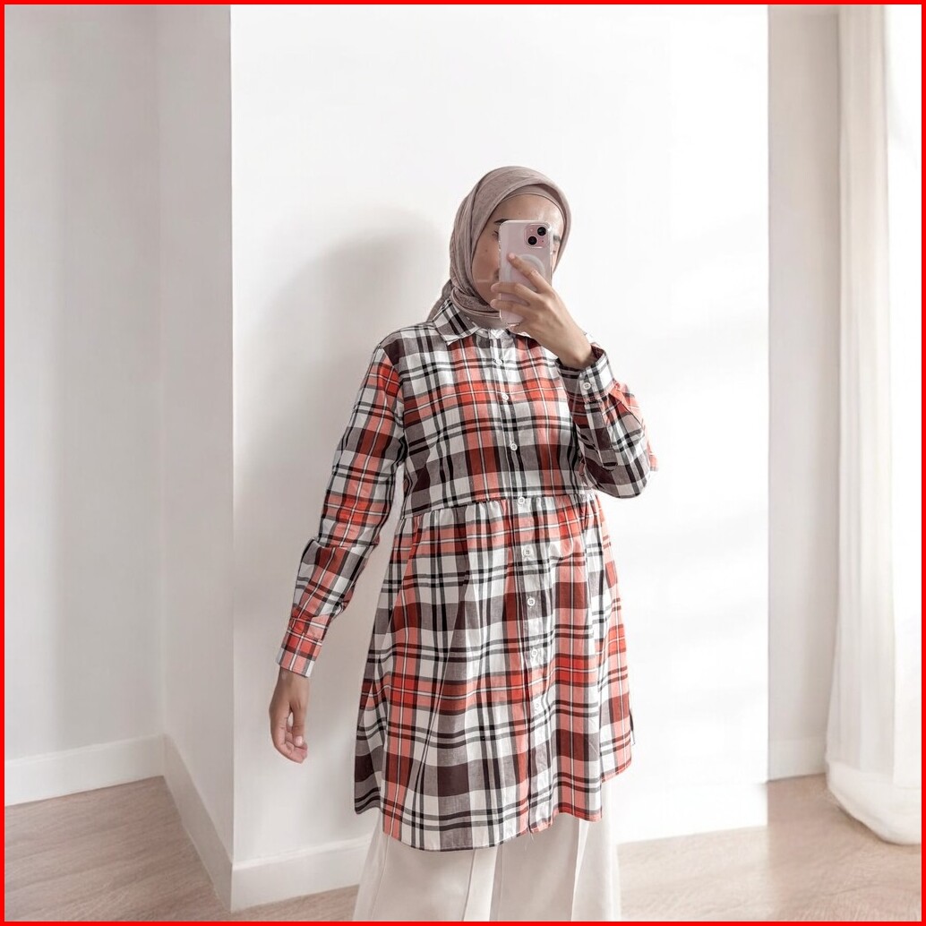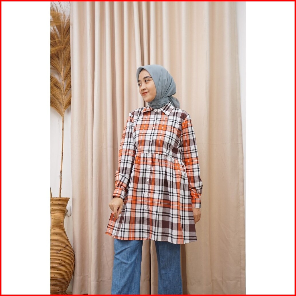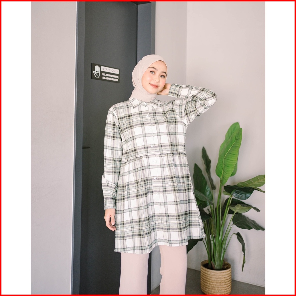Anyostore At65 Tartan Kemeja Tunik Flannel Wanita Pakaian Atasan Flanel Import Lengan Panjang Motif Kotak Kotak