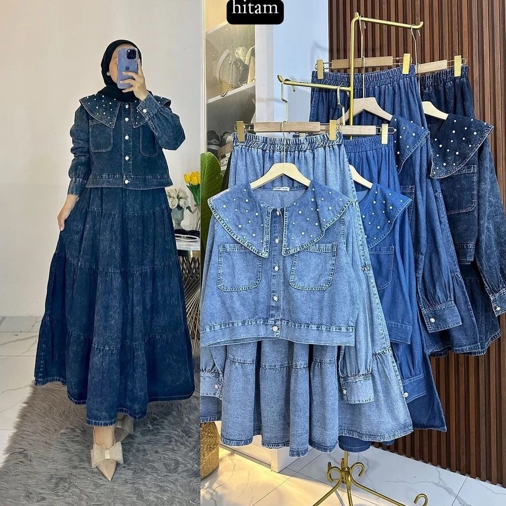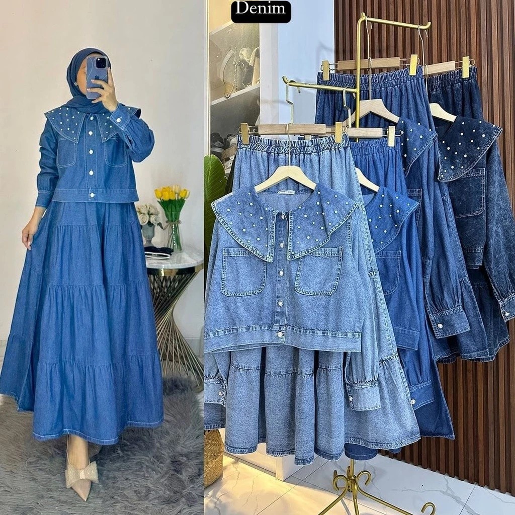 Outfit - Milana One Set Rok 2in1 Setelan Wanita Muslim Matt Jeans Apk Mutiara Premium