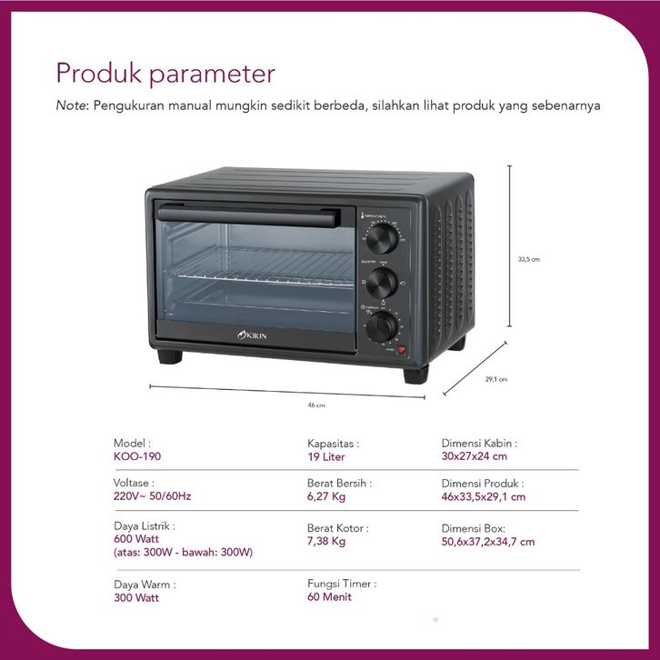 Oven Listrik Low Watt Berkualitas Kirin Omni Oven 19 Liter KBO-190 Oven Listrik Kirin