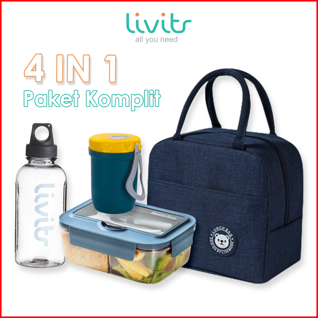 Paket 4 In 1 Kotak Bekal Kotak Makan Set Alat Makan 1400ml Tas Bekal Thermal Insulation Botol Minum 500ml Wadah Sup Atau