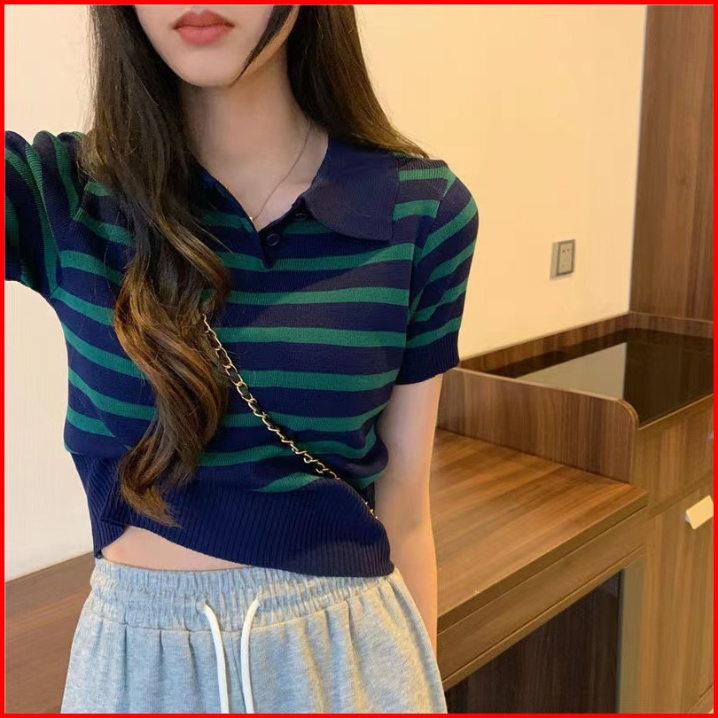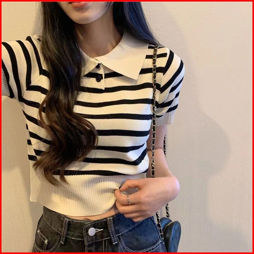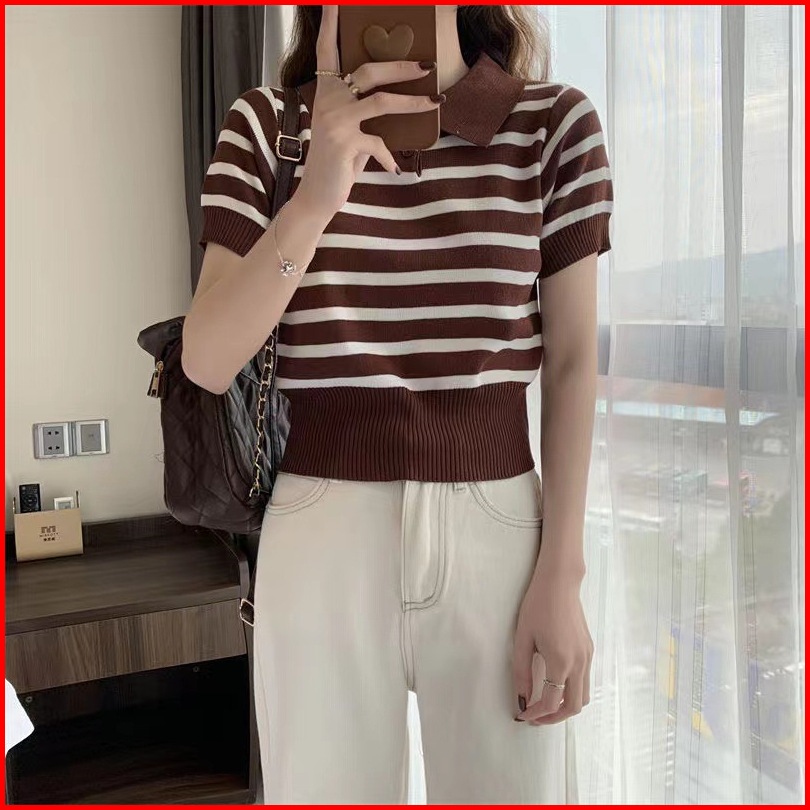 Jenny Atasan Wanita Polo Garis Rajut Korea 29019