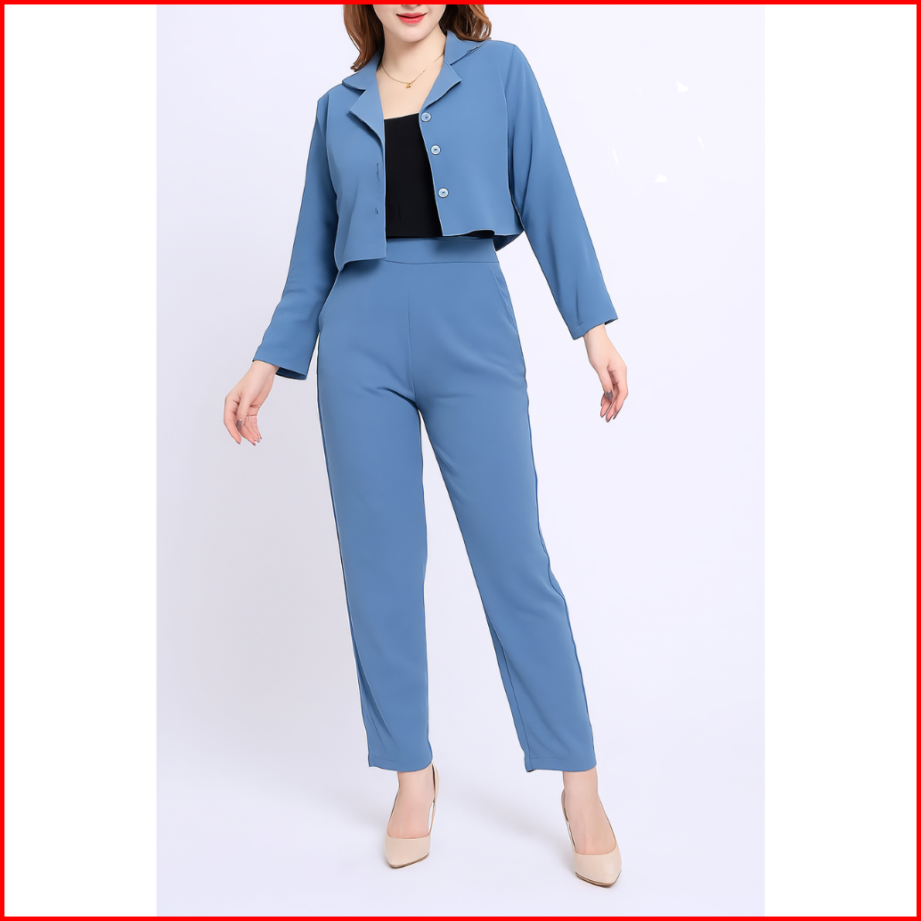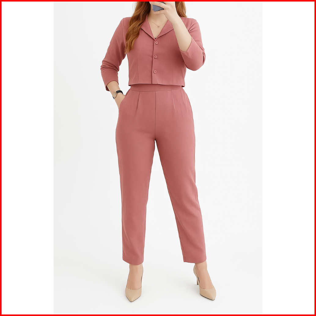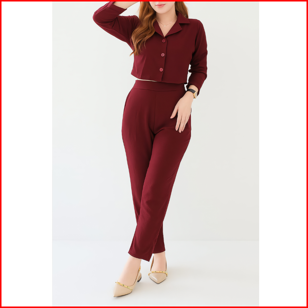 Oneset Kemeja Crop Polos Wanita Atasan Dan Celana Highwaist Warna Dusty