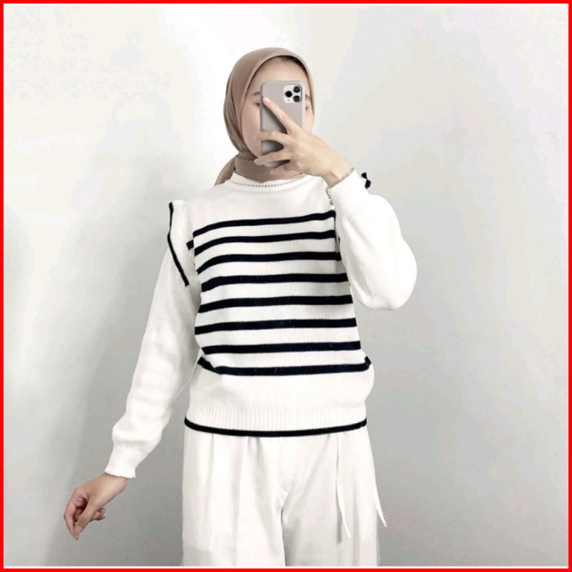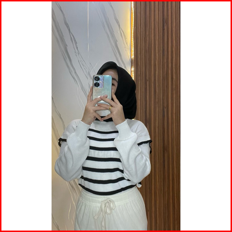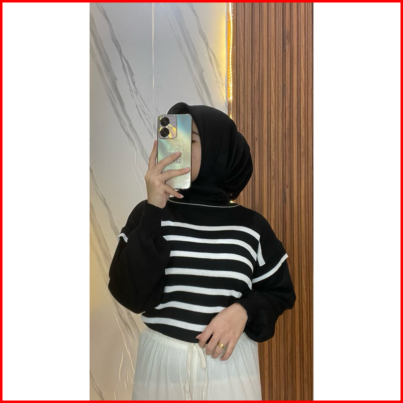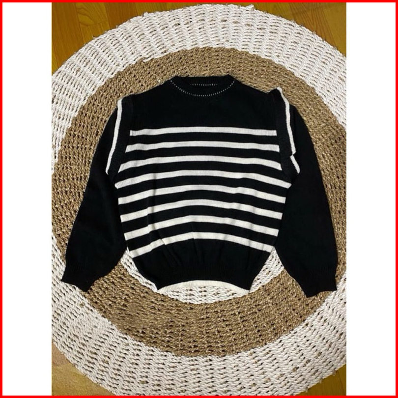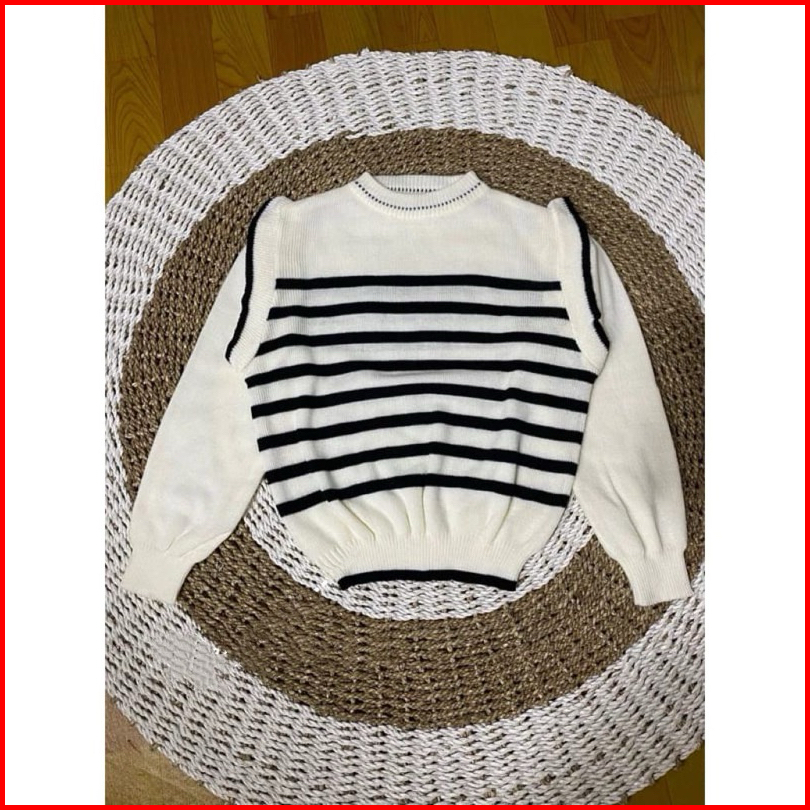 Atasan Knit Wanita Lengan Balon Lengan Panjang Basic Korean Minimalis Spandeks Rajut Motif Garis