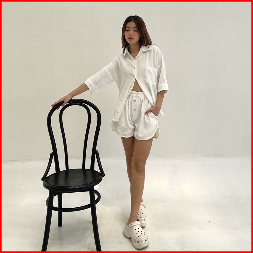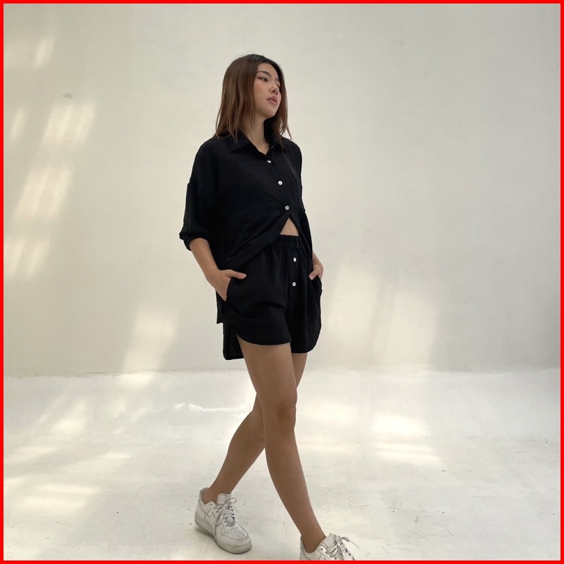 Byeol Set Setelan Wanita Crinkle Kemeja Set Celana Pendek Highwaist Highwaisted Shorts Pants