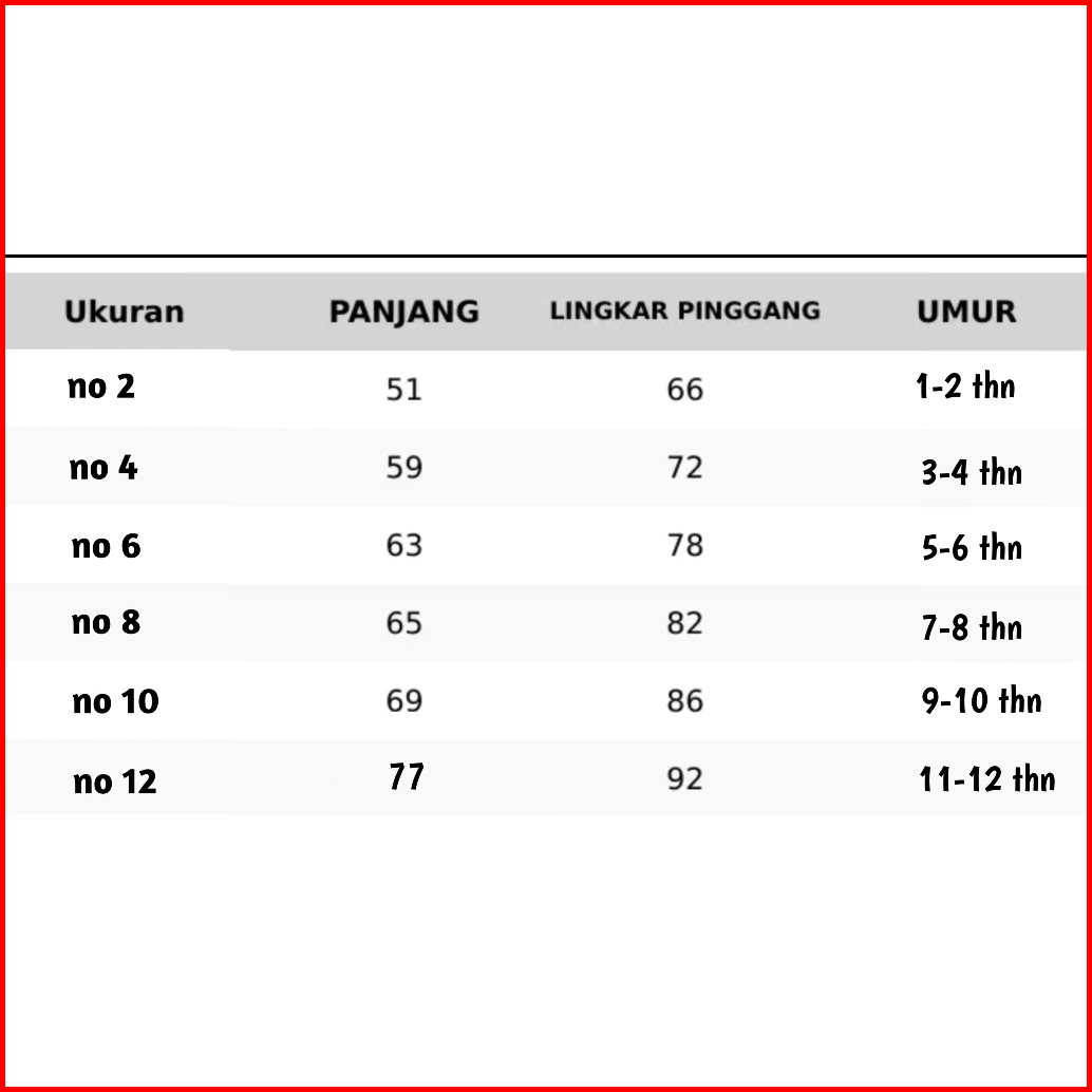no 2 usia 1-2 thn, no 4 usia 3-4 thn, no 6 usia 5-6 thn, no 8 usia 7-8 thn, no 10 usia 9-10 thn, no 12 usia 11-12 thn