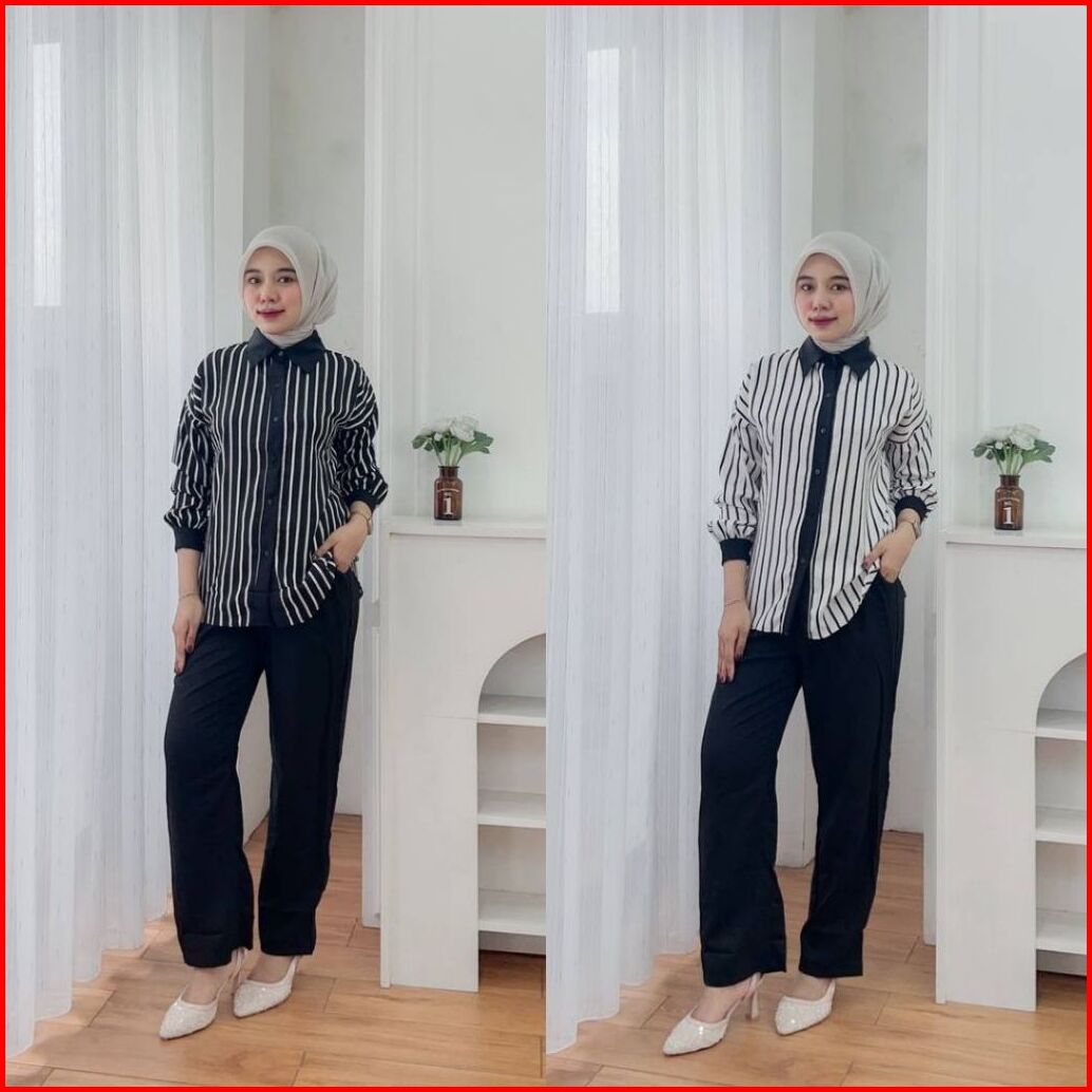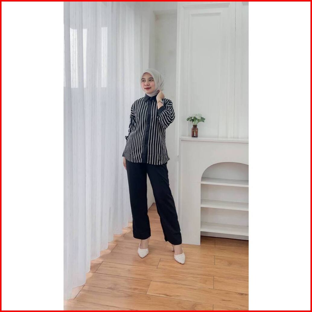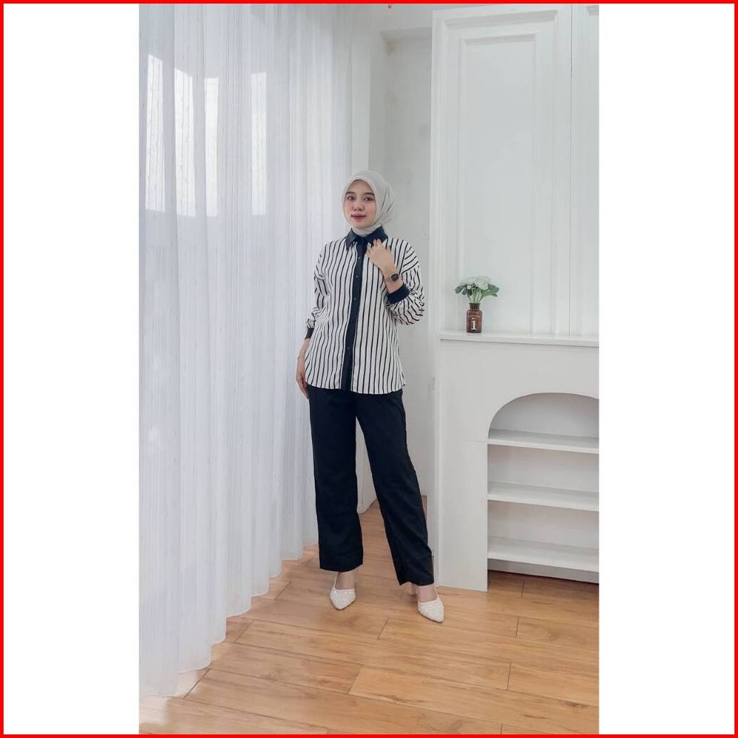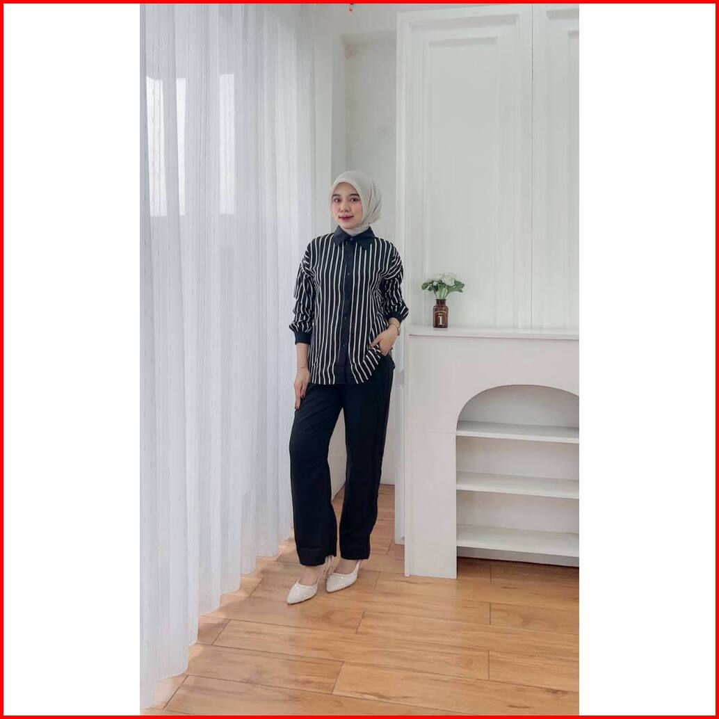 Nira Stripy Set Shakila Setelan Wanita Kemeja Garis Salur Hitam Putih Oneset Salur