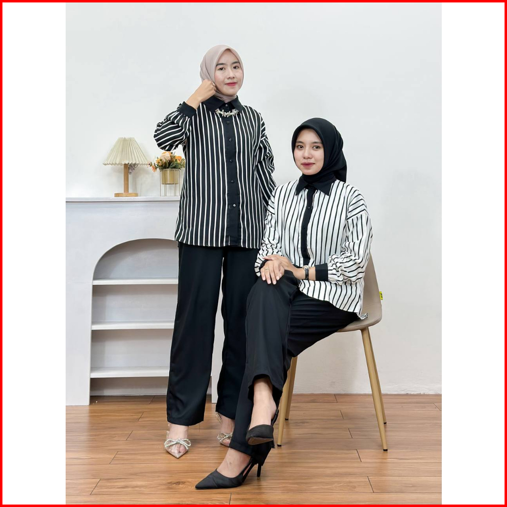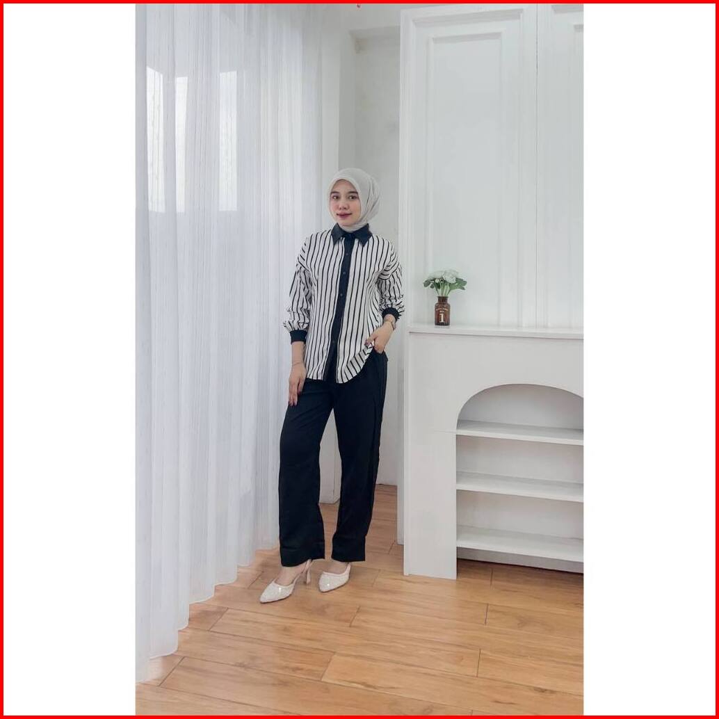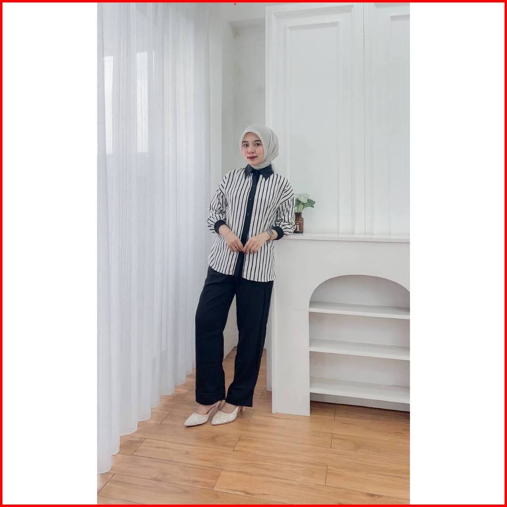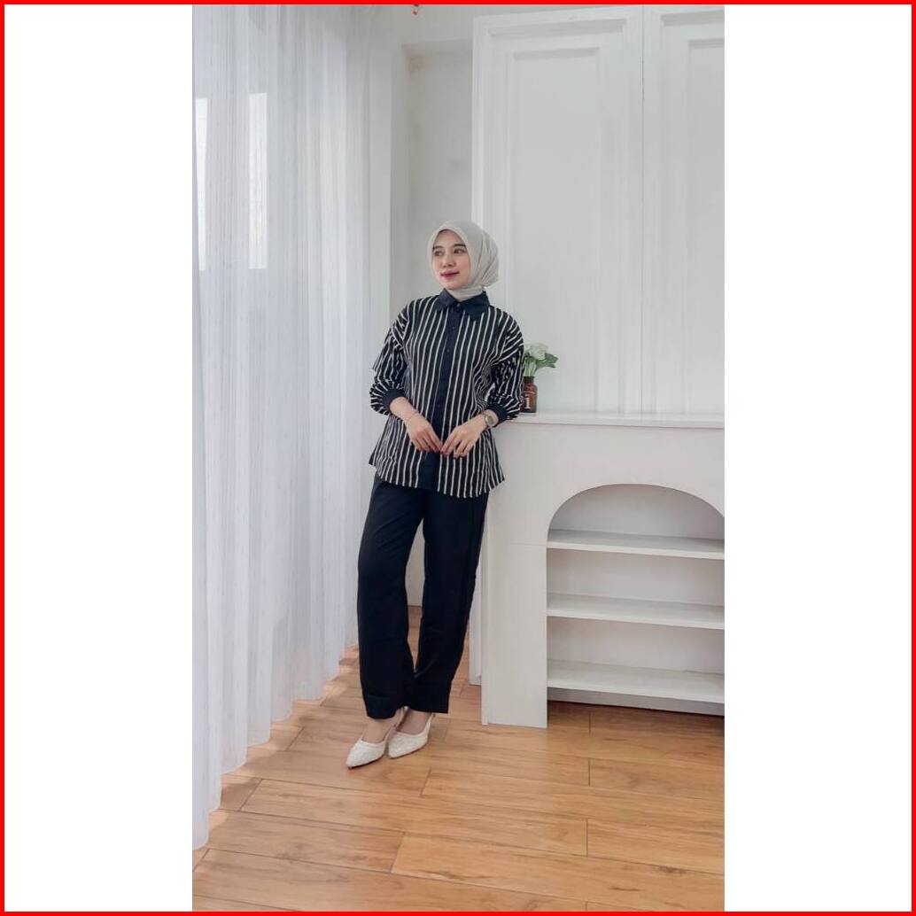 Nira Stripy Set Shakila Setelan Wanita Kemeja Garis Salur Hitam Putih Oneset Salur