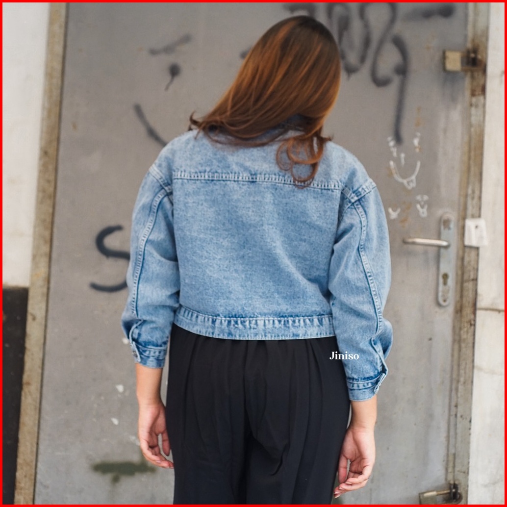 Jiniso Big Size Jaket Crop Jeans Oversize Pocket Blue Acid