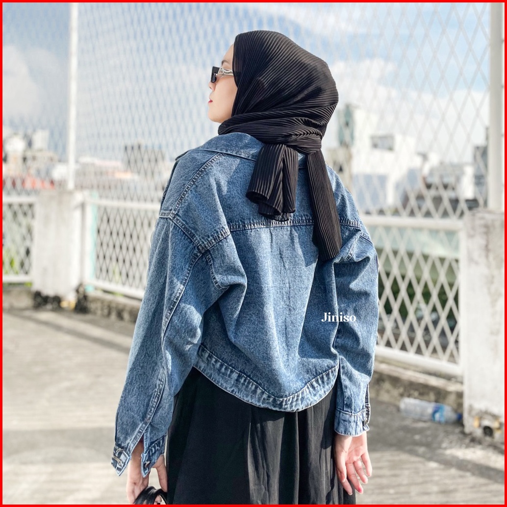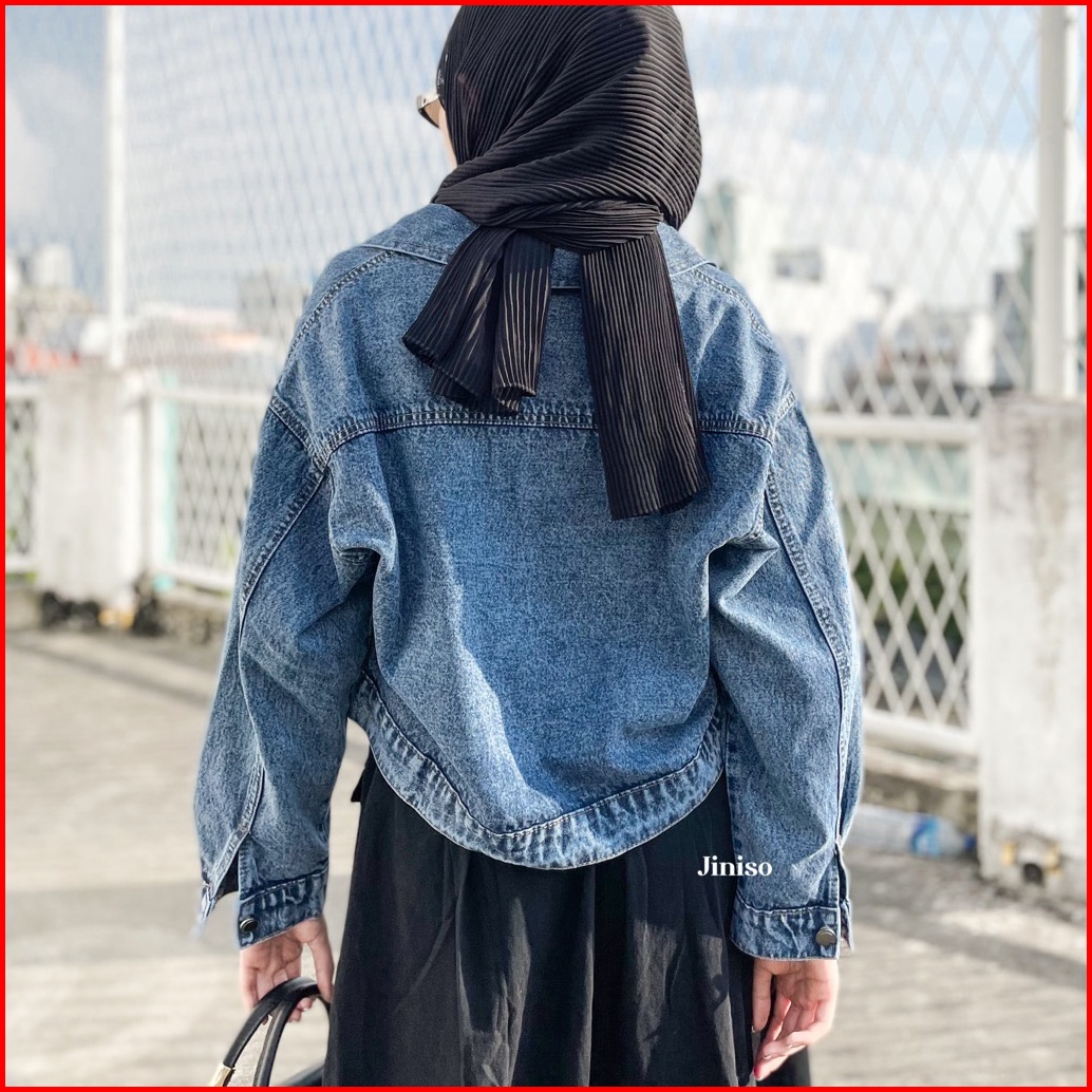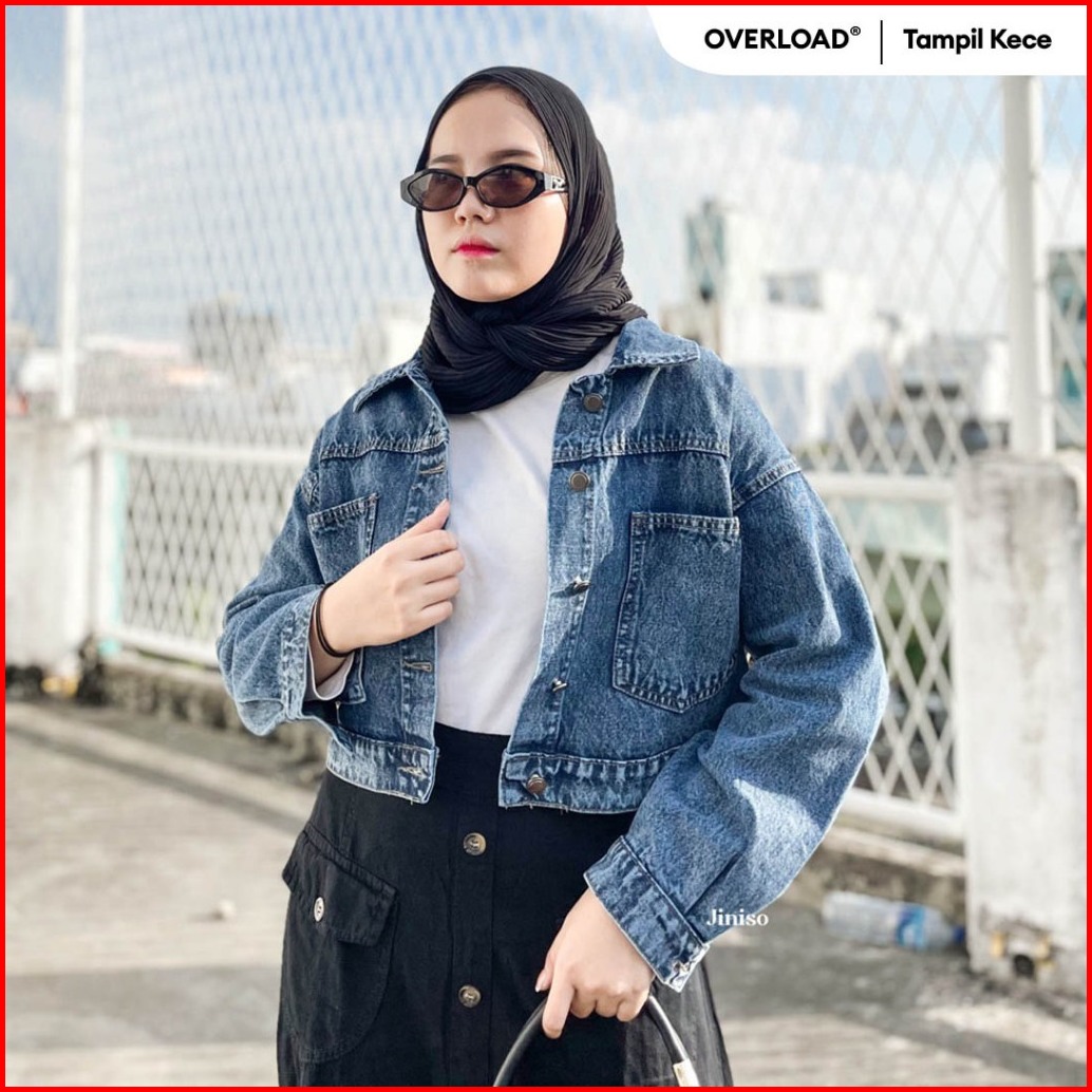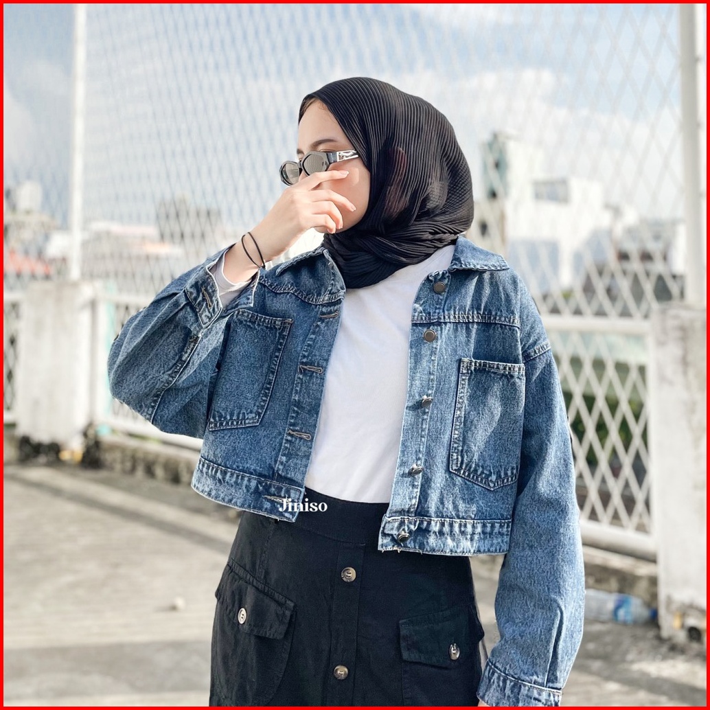Jiniso Jaket Crop Jeans Oversize Pocket Blue Acid