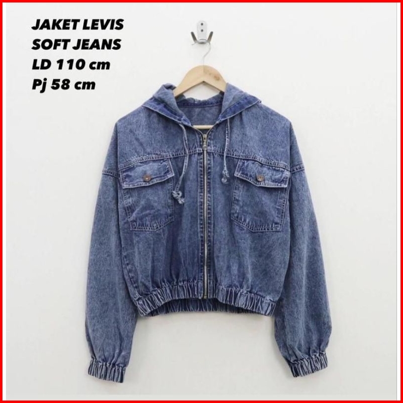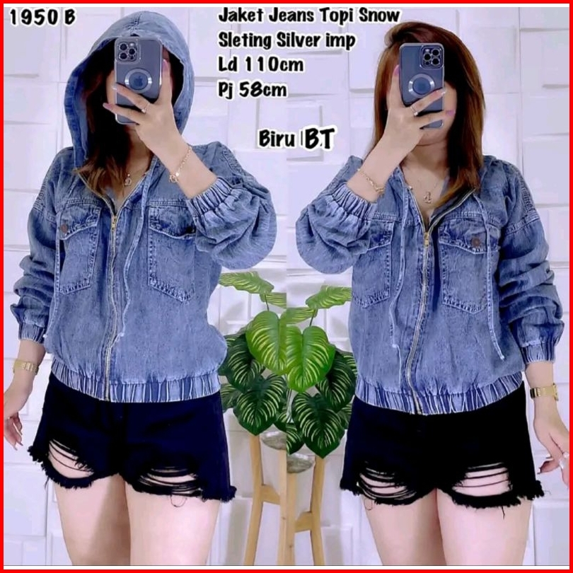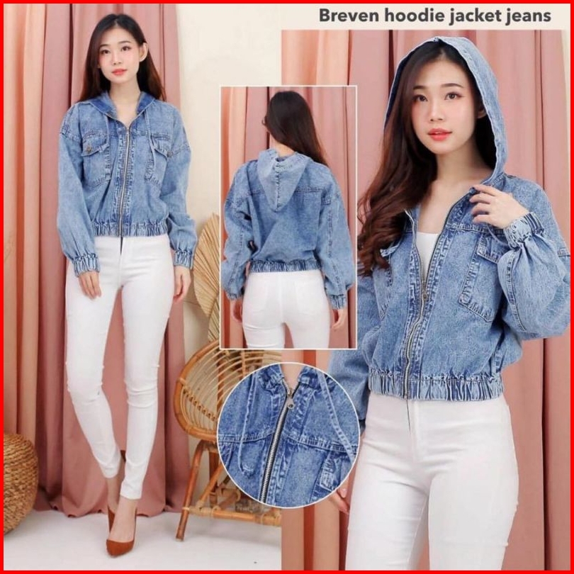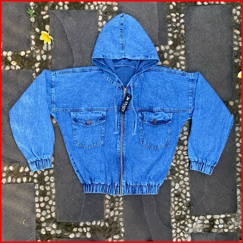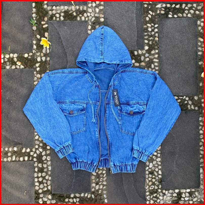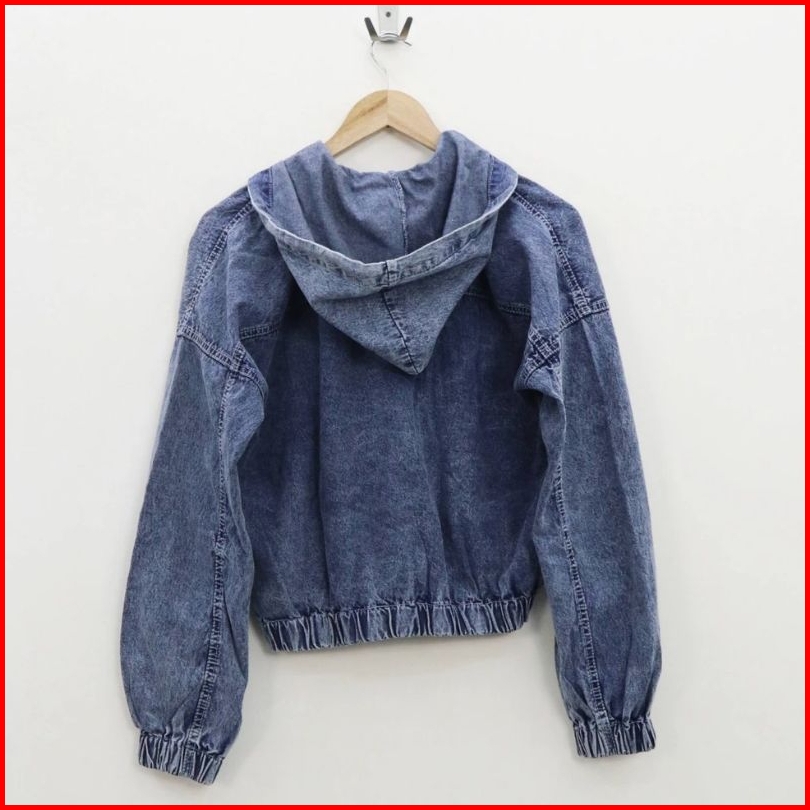 Jaket Jeans Zipper Hoodie Wanita Crop Terbaru Washing Snow Biru