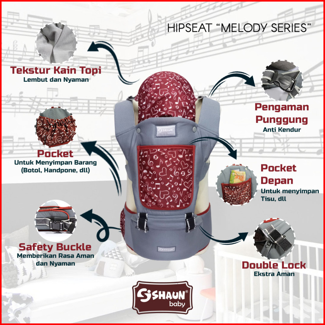 Gendongan Bayi Depan Duduk 7in1 Posisi Penutup Kepala Hipseat Multi Fungsi Series Melody Shaunbaby