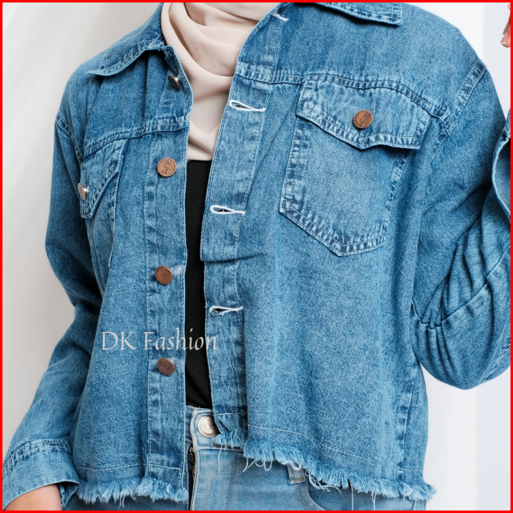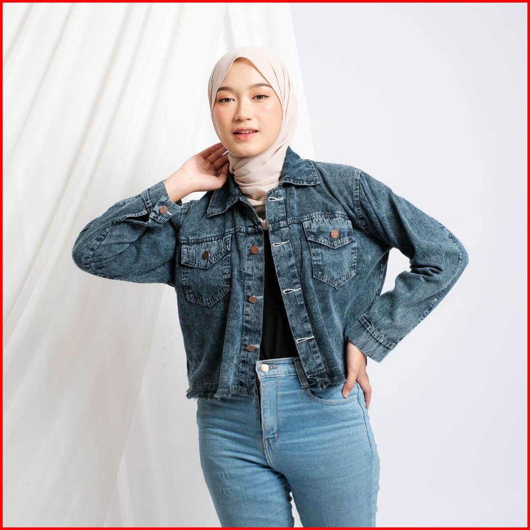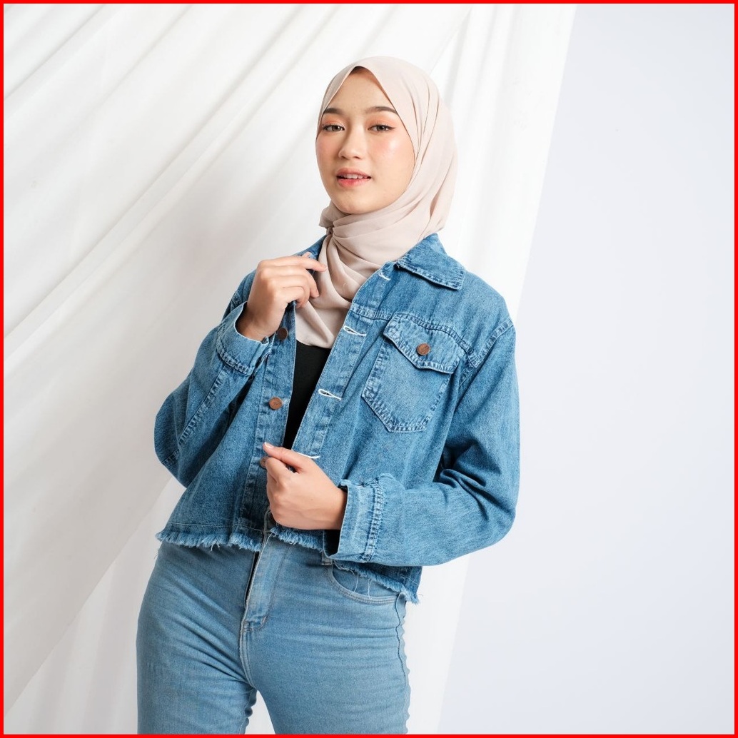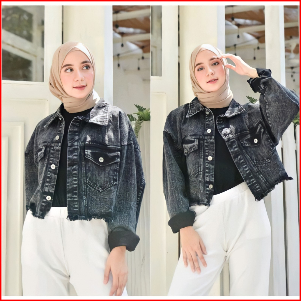 Jaket Jeans Wanita Reguler Fit Vintage Crop Top Rawis Outfit Kasual Remaja Perempuan