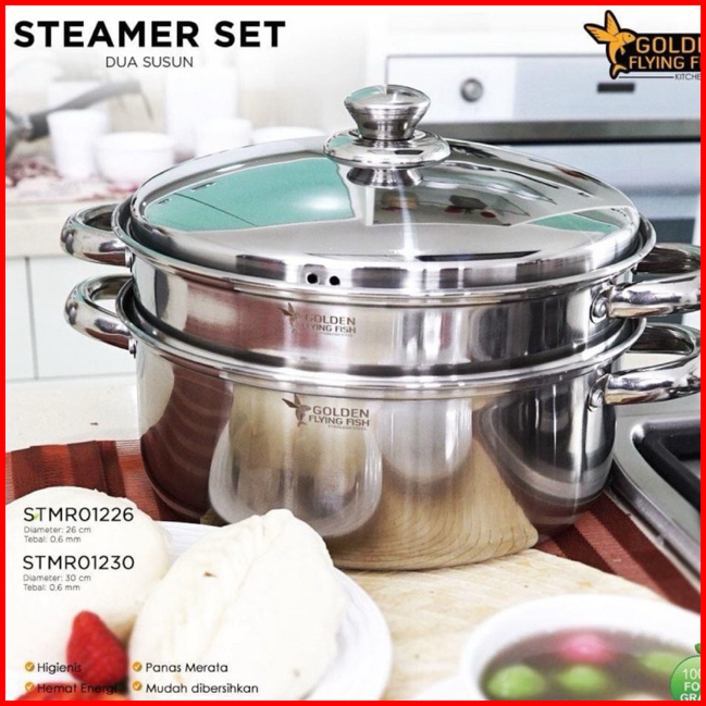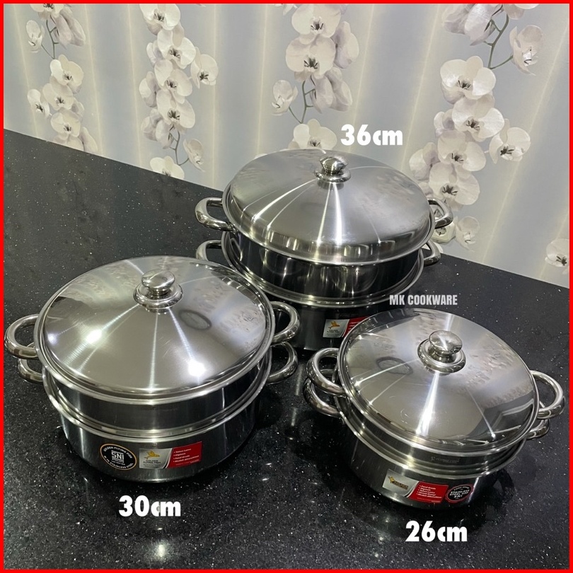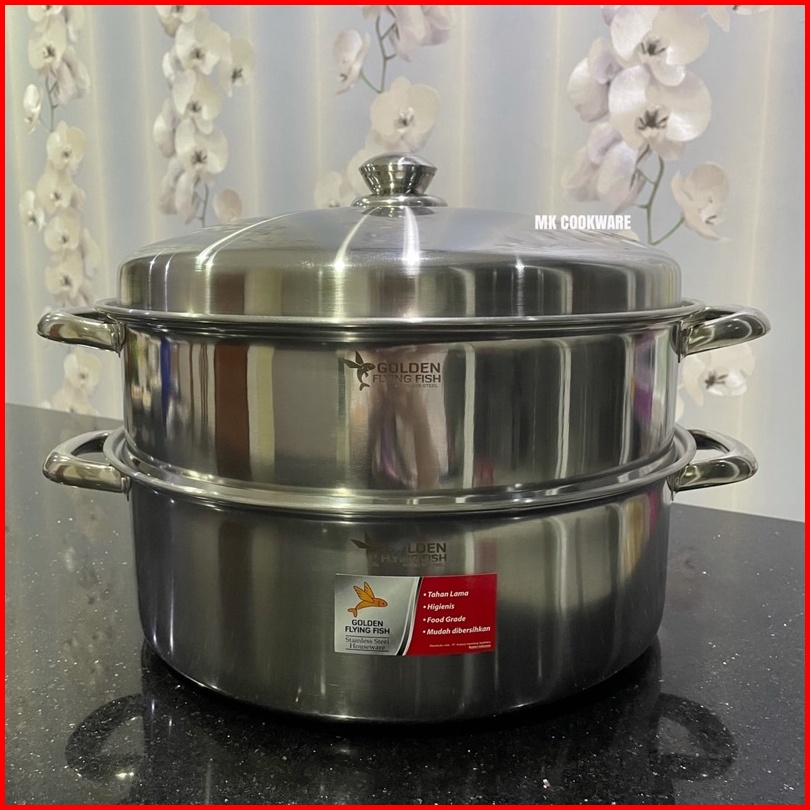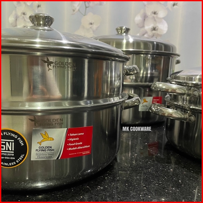 Steamer Set Susun Golden Flying Fish - Stainless Steel - 36cm - Panci Kukusan Susun Tingkat 2 - Tutup Kaca Stainless - S