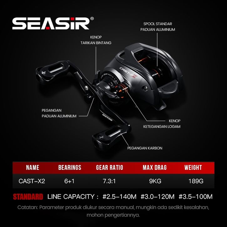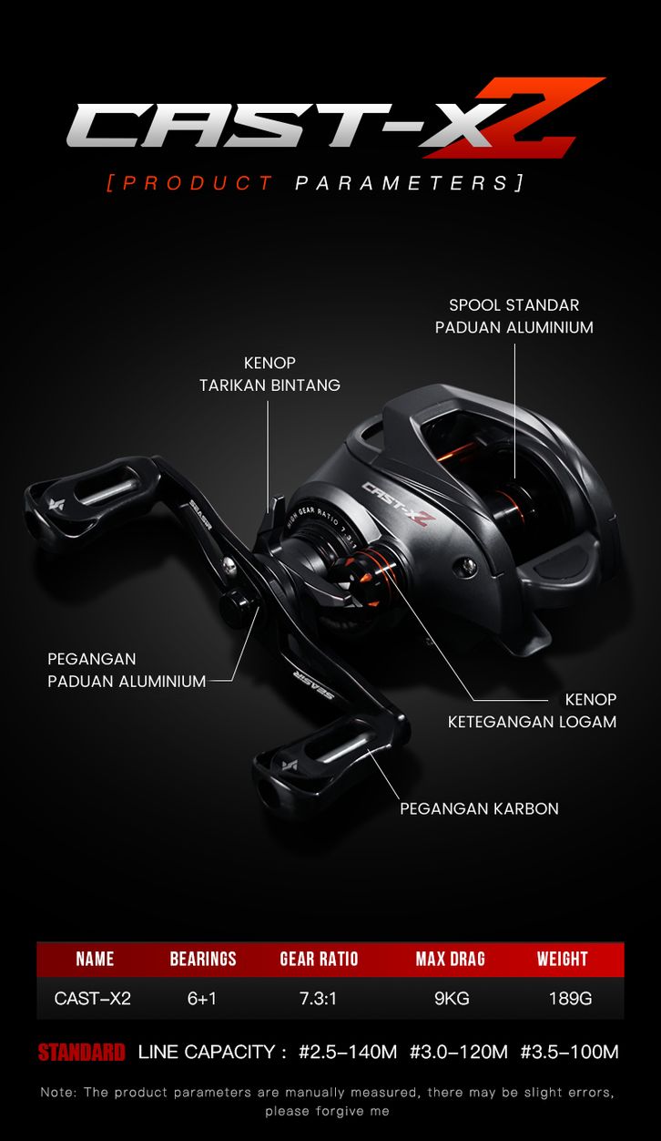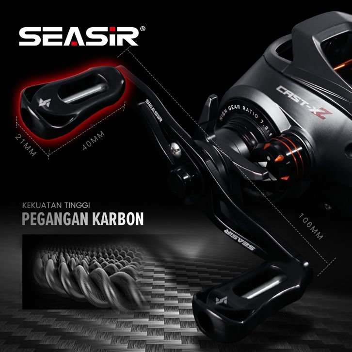 Reel BC Baitcasting SEASIR CAST X2 Pancing+1 Spool Aluminium Ceramic Bearings 6+1BB, Rasio Gigi 7.3:1