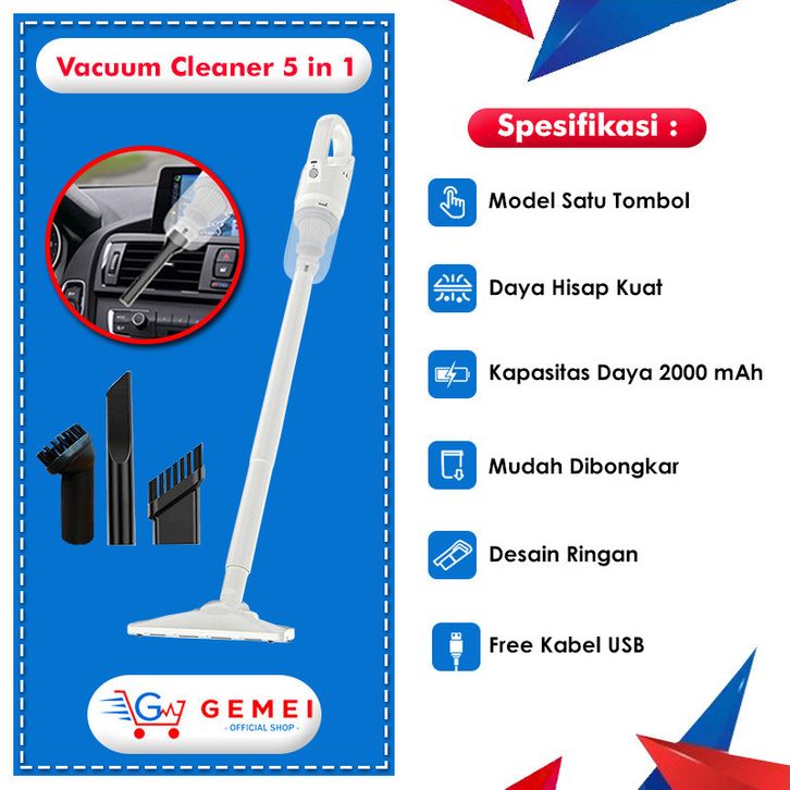 Gemei Vacuum Cleaner Wireless Alat Penyedot Debu Mobil 5in1 Kapasitas Daya 2000mAh