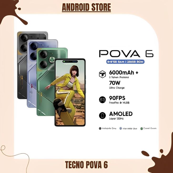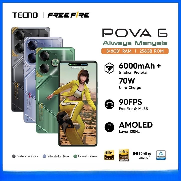 TECNO POVA 6 NFC 8+8GB*/256GB AMOLED 6,78” FHD+ 120HZ 6000MAH+70W ULTRA CHANGE MTK HELIO G99 108MP+AI CAM+32MP TERMURAH