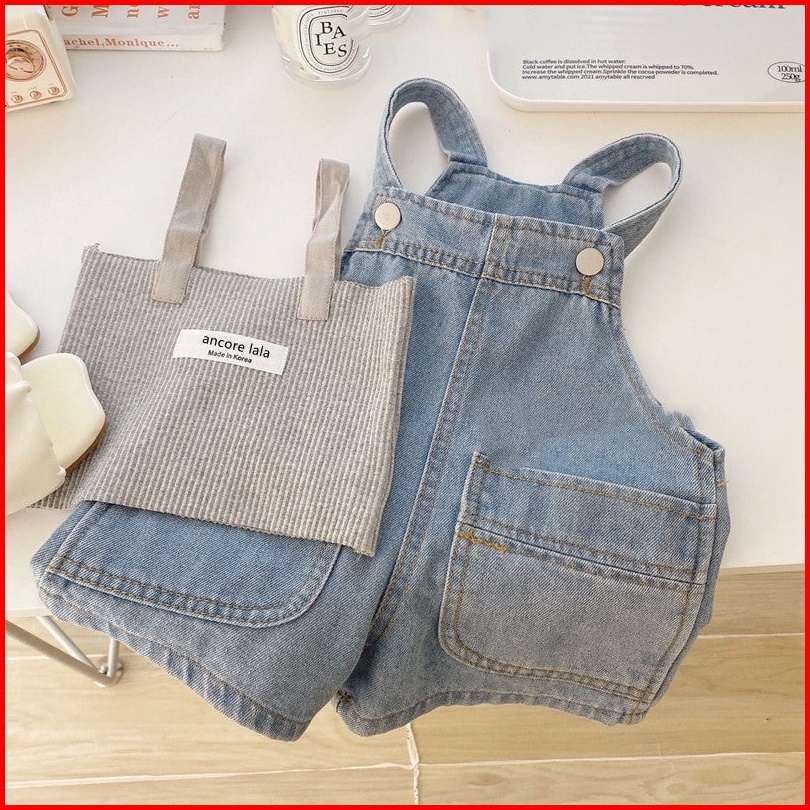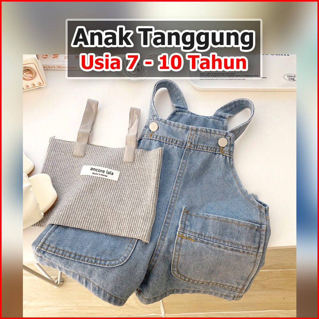 Babyhoki Store Usia 7 8 9 10 Tahun Baju Anak Tanggung Cewek 363634 - Setelan Baju Crop Overall Jeans Anak Perempuan - Mo