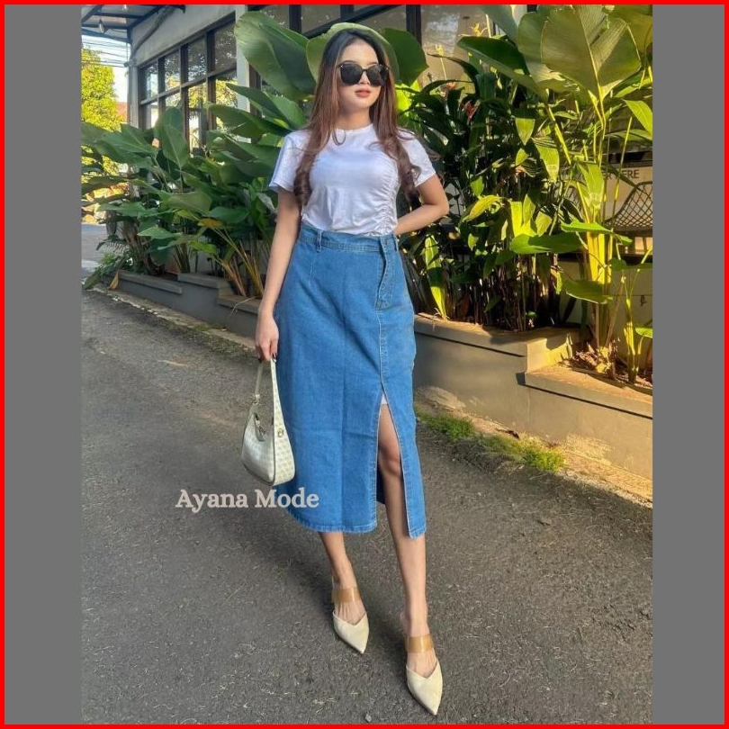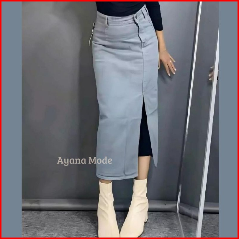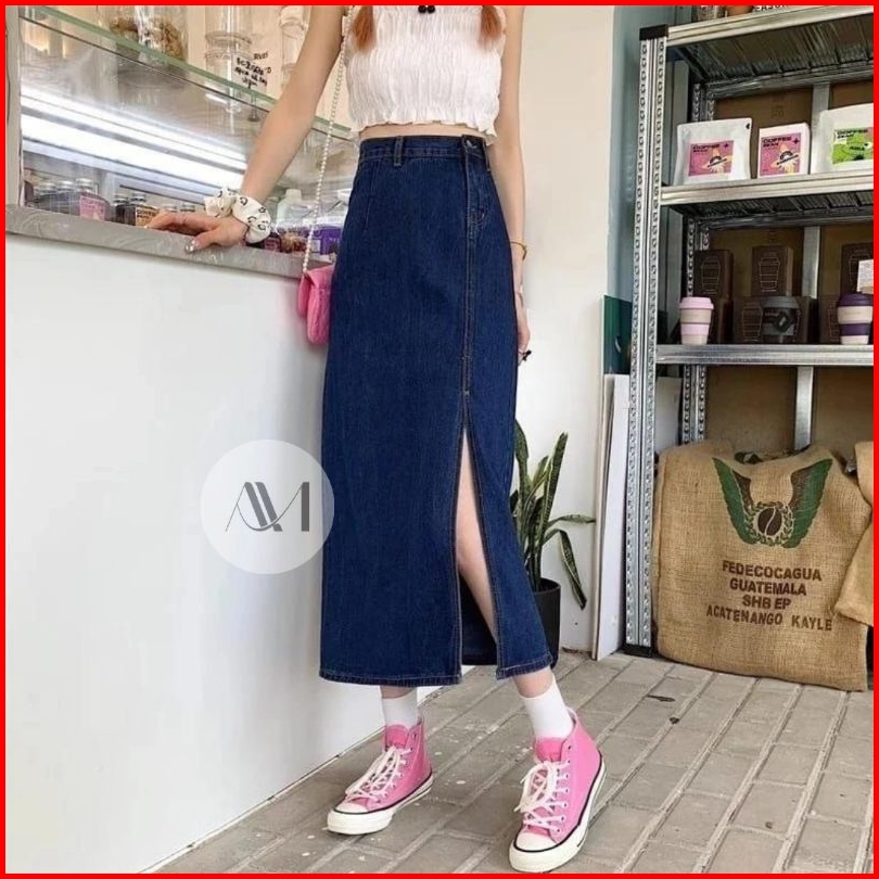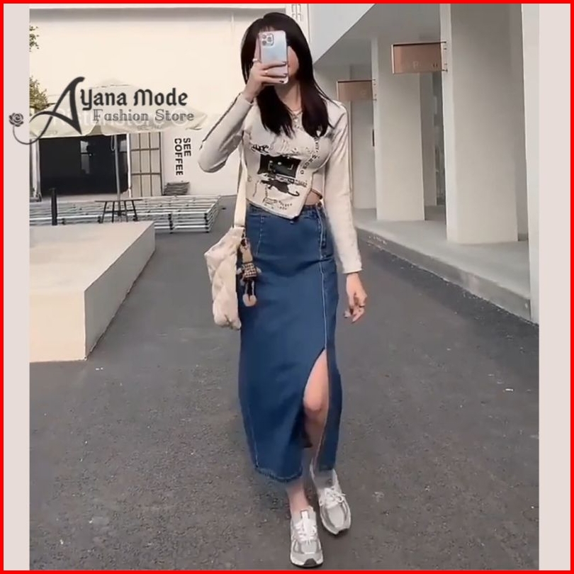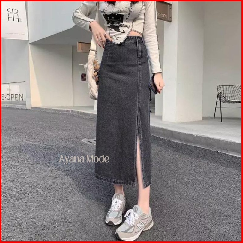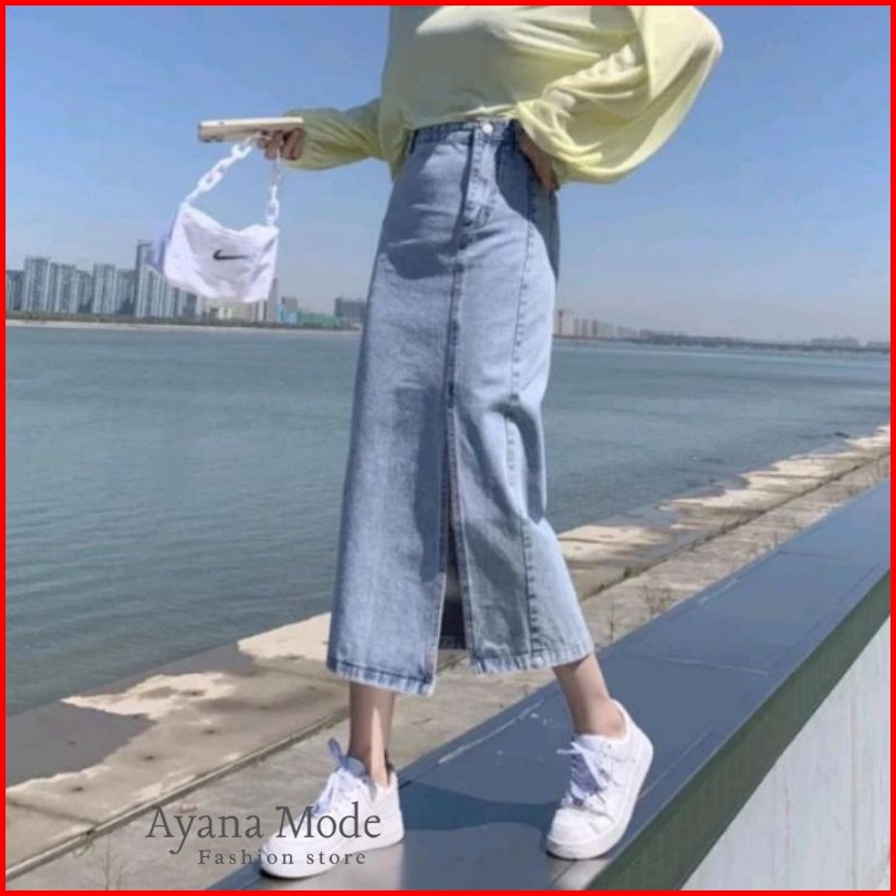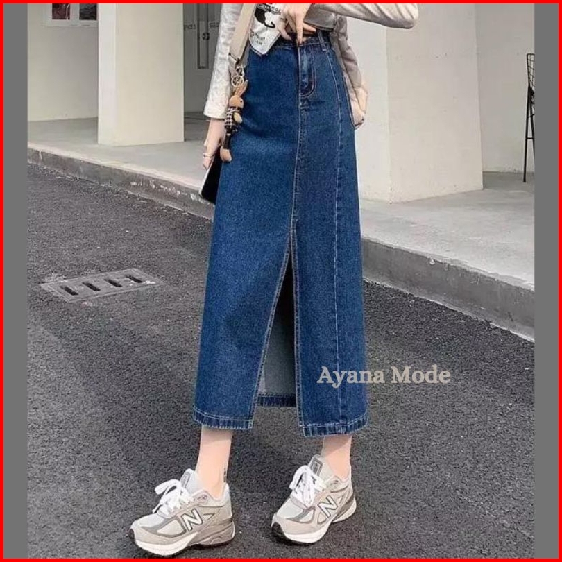 Ayana Rok Jeans Highwaist Split A Line Maxi Skirt Korean Style Premium Denim