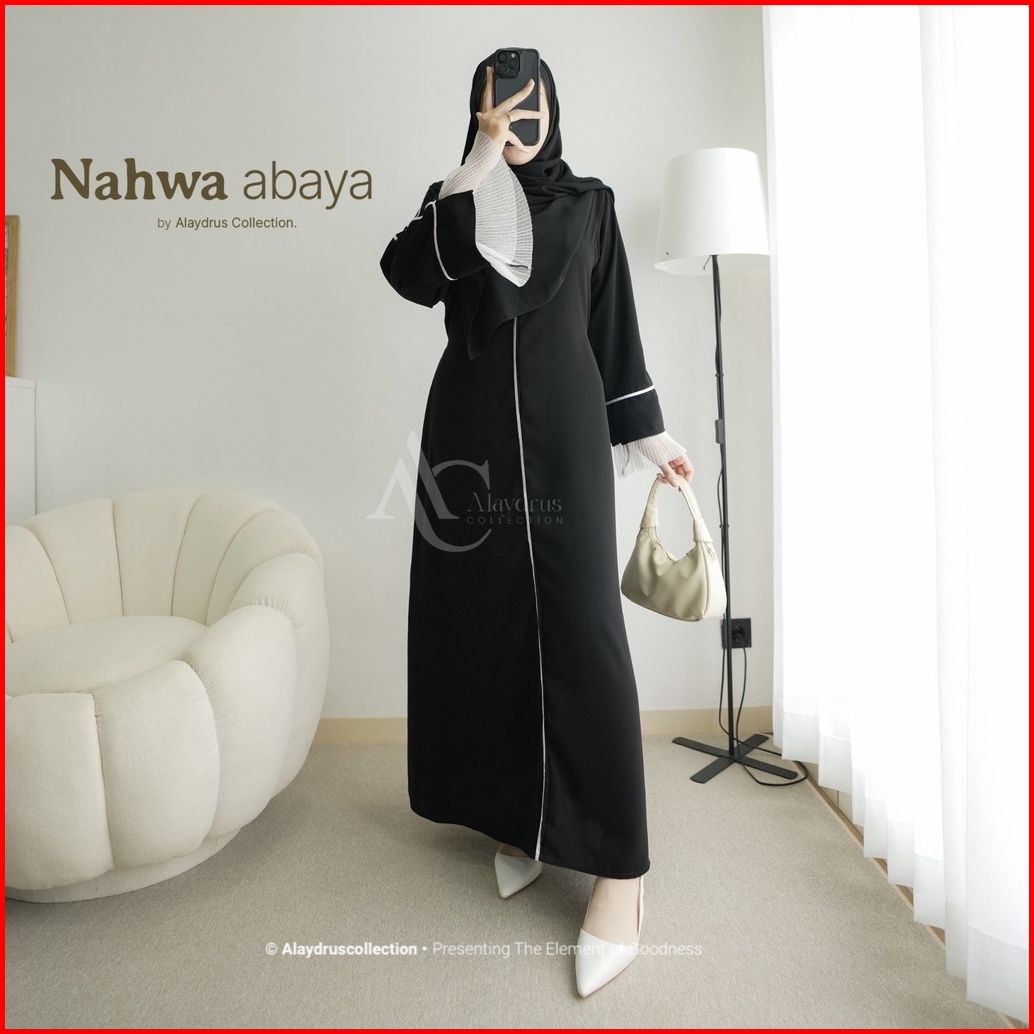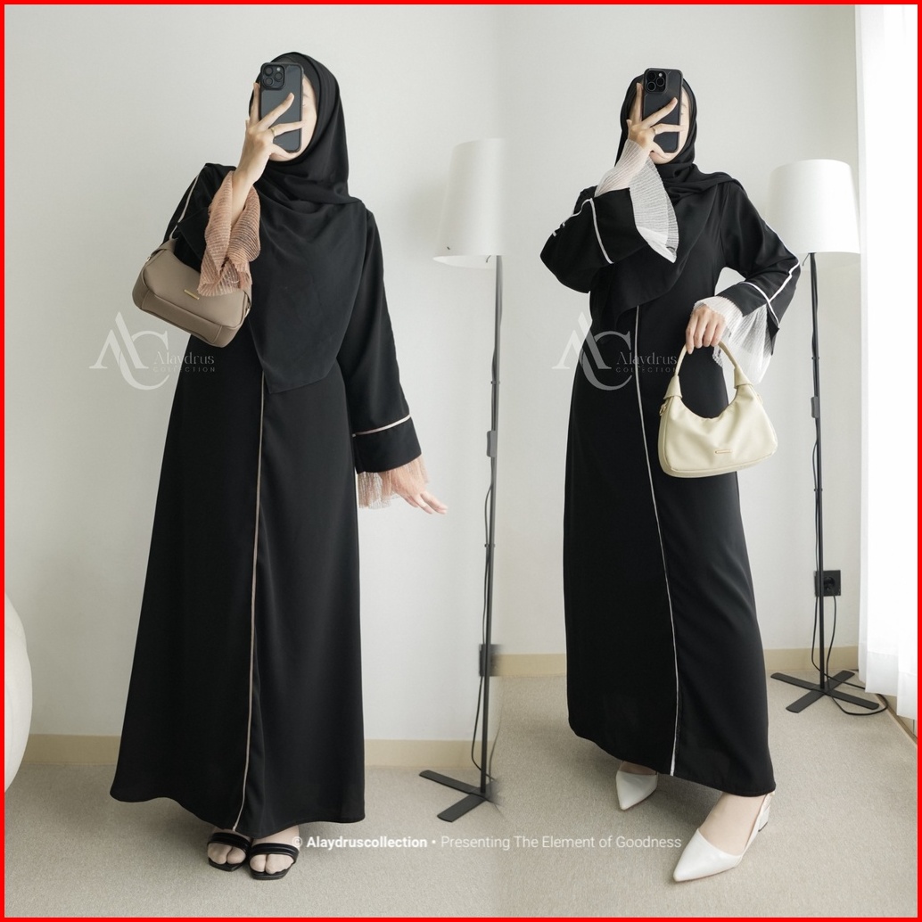 Alaydrus Collection Nahwa Abaya Hitam Turkey Gamis Syari Muslimah Bahan Jetblack Kombinasi Plisket
