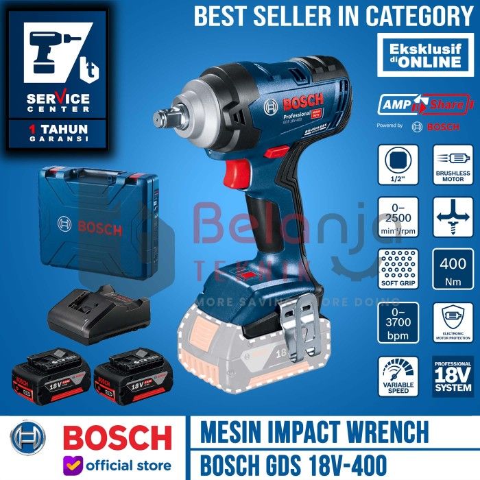 Bosch Mesin Impact Wrench Cordless GDS 18V-400 Charger Baterai 4 Ah - 1 Baterai impact baterai