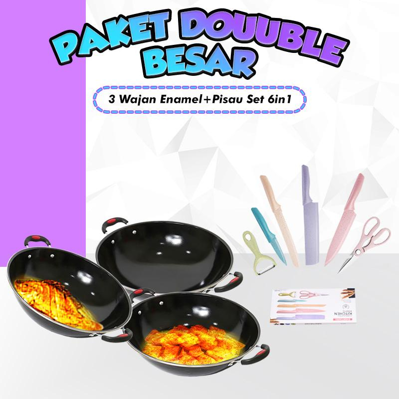 Paket Spesial Hemat Wajan Enamel 34cm Penggorengan 3 Pcs+ Pisau Set 6in1