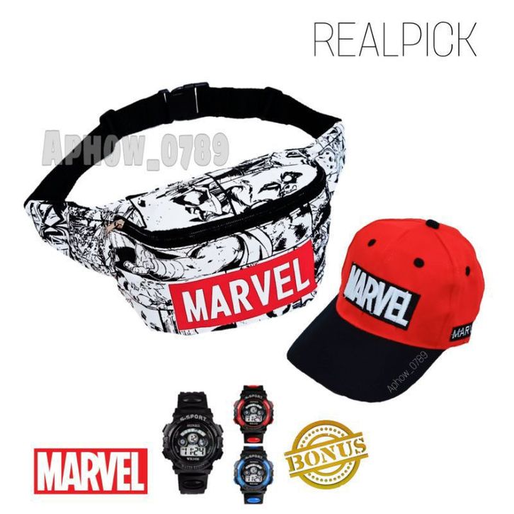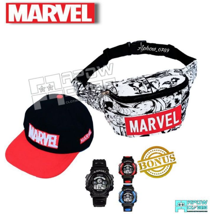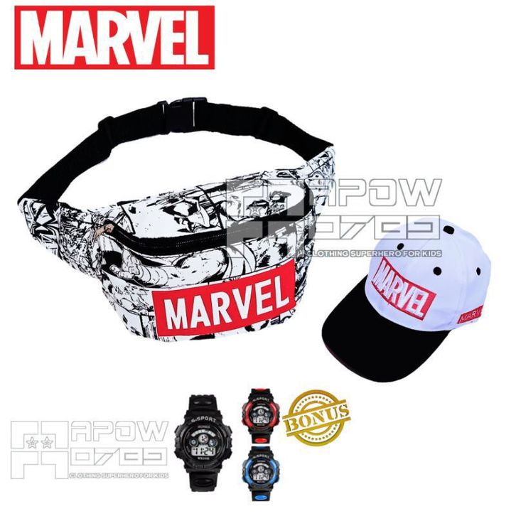 tas selempanh bahu waistbag canvas anak laki laki karakter marveel 3in1 - tas + topi+ jam
