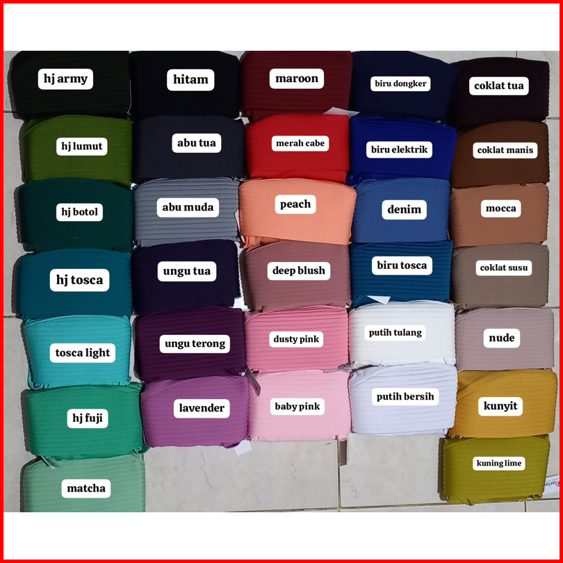 Hitam, Putih, Ungu Tua, Biru Dongker, Coklat Susu, Biru Elektrik, Fuschia, Pink Fanta, Merah Cabe, Hijau Daun, Abu Muda, Maroon, Putih Tulang, Orange Bata, Lavender, Dusty Pink, Kuning Kunyit, Cokelat Tua, Mocca, Hijau Army, Vanilla Blue, Abu Tua, Hijau Fuji, Rose, Nude, Denim, Plum, Deep Blush, Sage, Slate Grey, Kuning Lime, Biru Tosca, Hjau Botol, Hijau Tosca, Coklat Manis