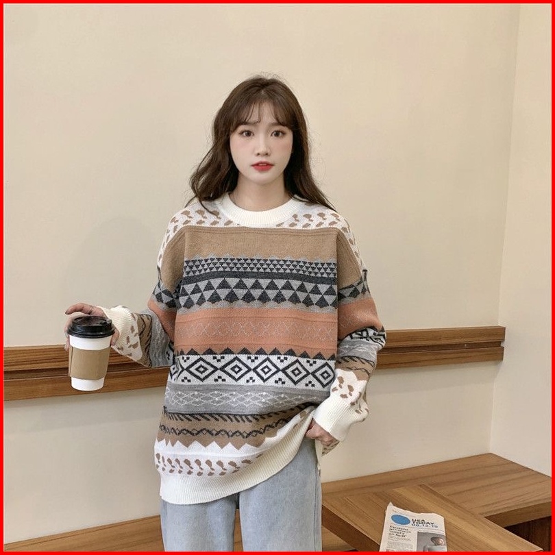 Sweater Kerah Kru Wanita Vintage Longgar Kasual Lengan Panjang Atasan Rajut