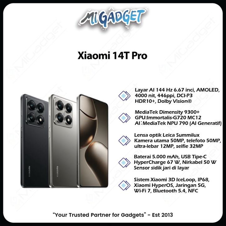 Xiaomi 14T Pro 12/512 Lensa Optik Leica 144Hz HyperCharge 120W Nirkabel 50W IP68 ( Mi Gadget Malang )