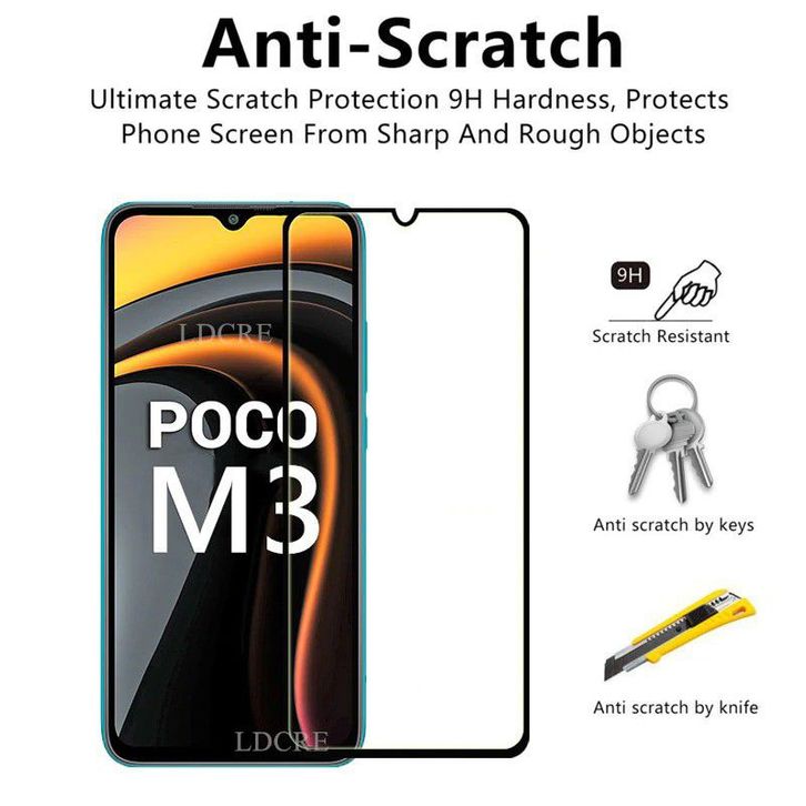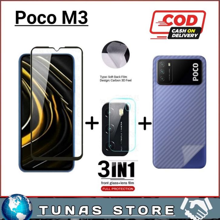 (PROMO) PAKET 3 IN 1 XIAOMI POCO M3 2020 TG ANTI GORES KACA FULL COVER + ANTI GORES CAMERA + GARSKIN 3D