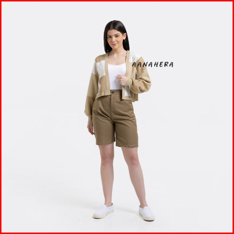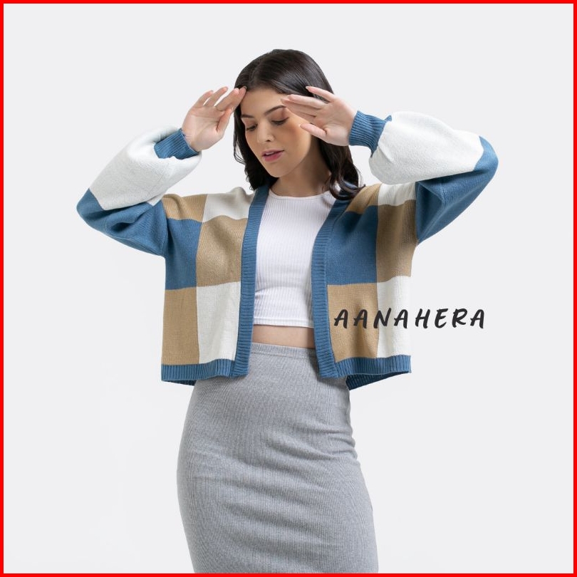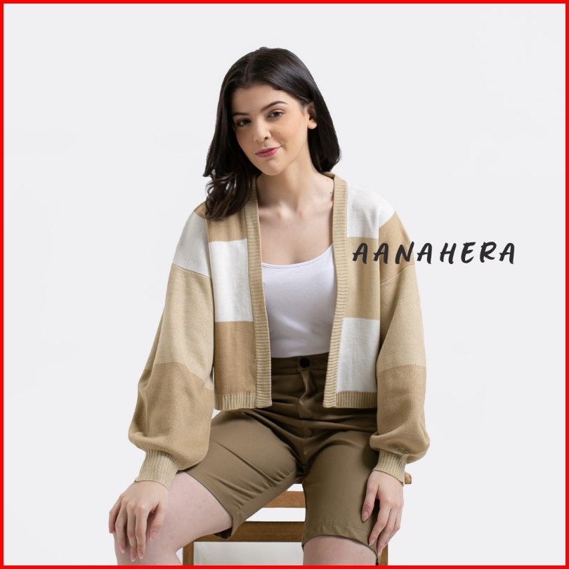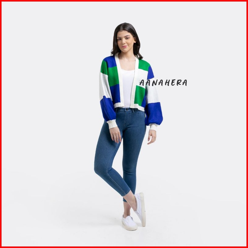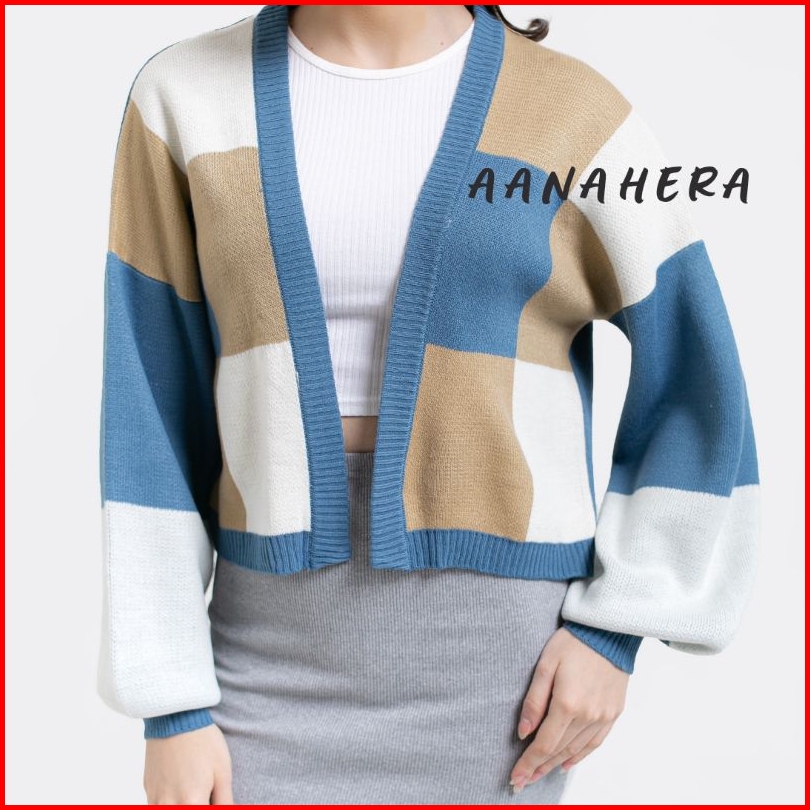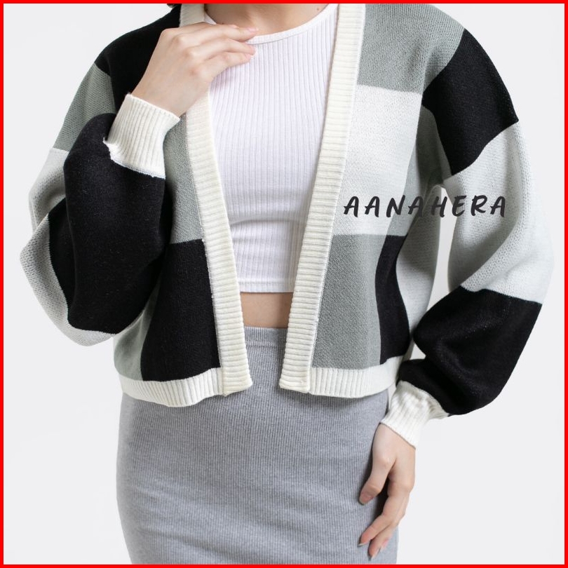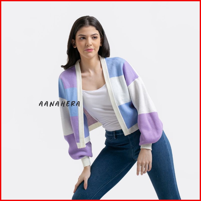 Aether Crop Top Cardy Colorblock Knitwear Outer Wanita Cardigan Rajut