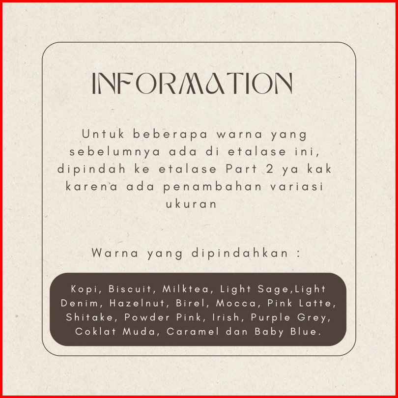 Black, Putih Bersih, Broken White, Navy, Dark grey, Abu Muda, Fosil latte, Stone Light, Dusty pink, Pink nude, Millo Purple, Khaky, Ivory, Coksu, Prafucino Grey, Army, Soft Green, Maroon, Yellow, Moccacino, Waffle Creamy, Cream, Nutella, Dark Stone, Coklat Mahogany, Latte, Denim, Still Blue, Bold Green, Silver Grey, Pastel Pink, Purple Grey, Bergundy