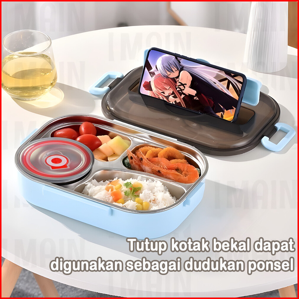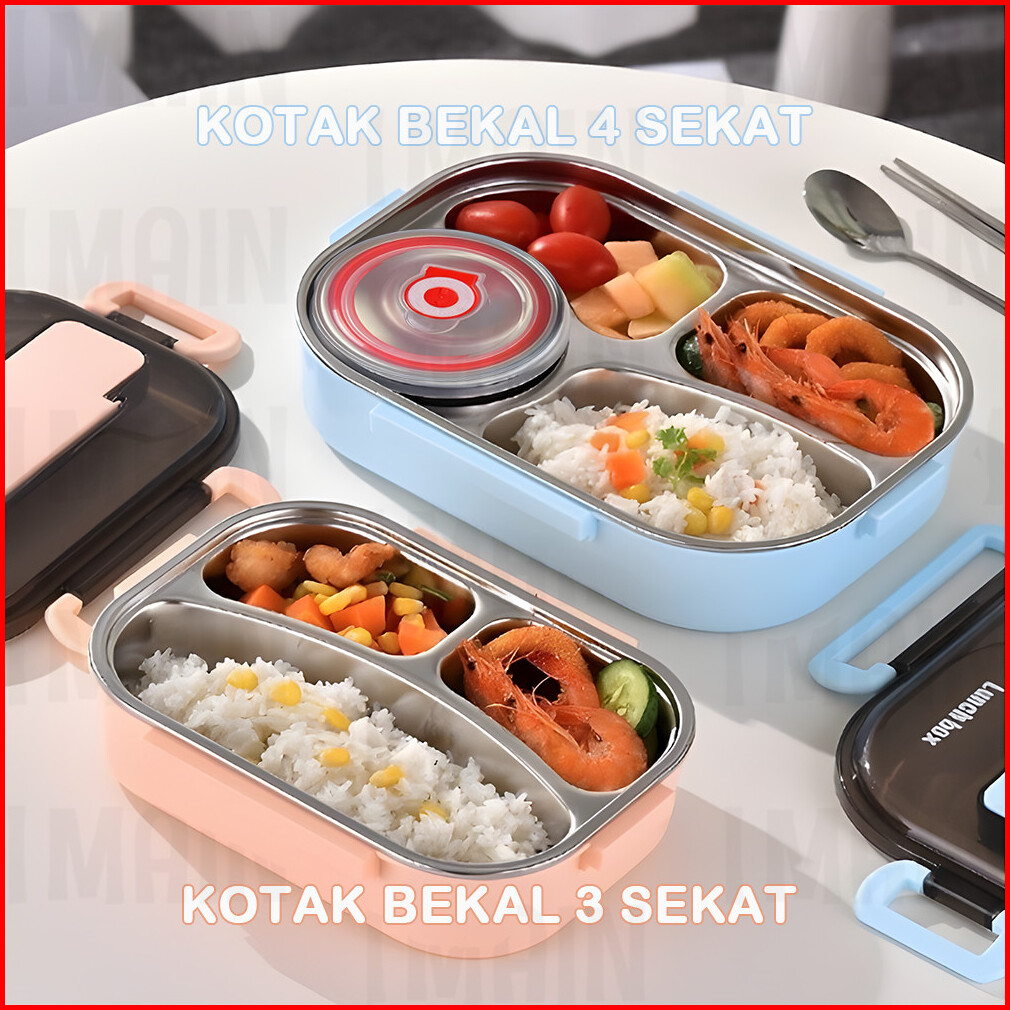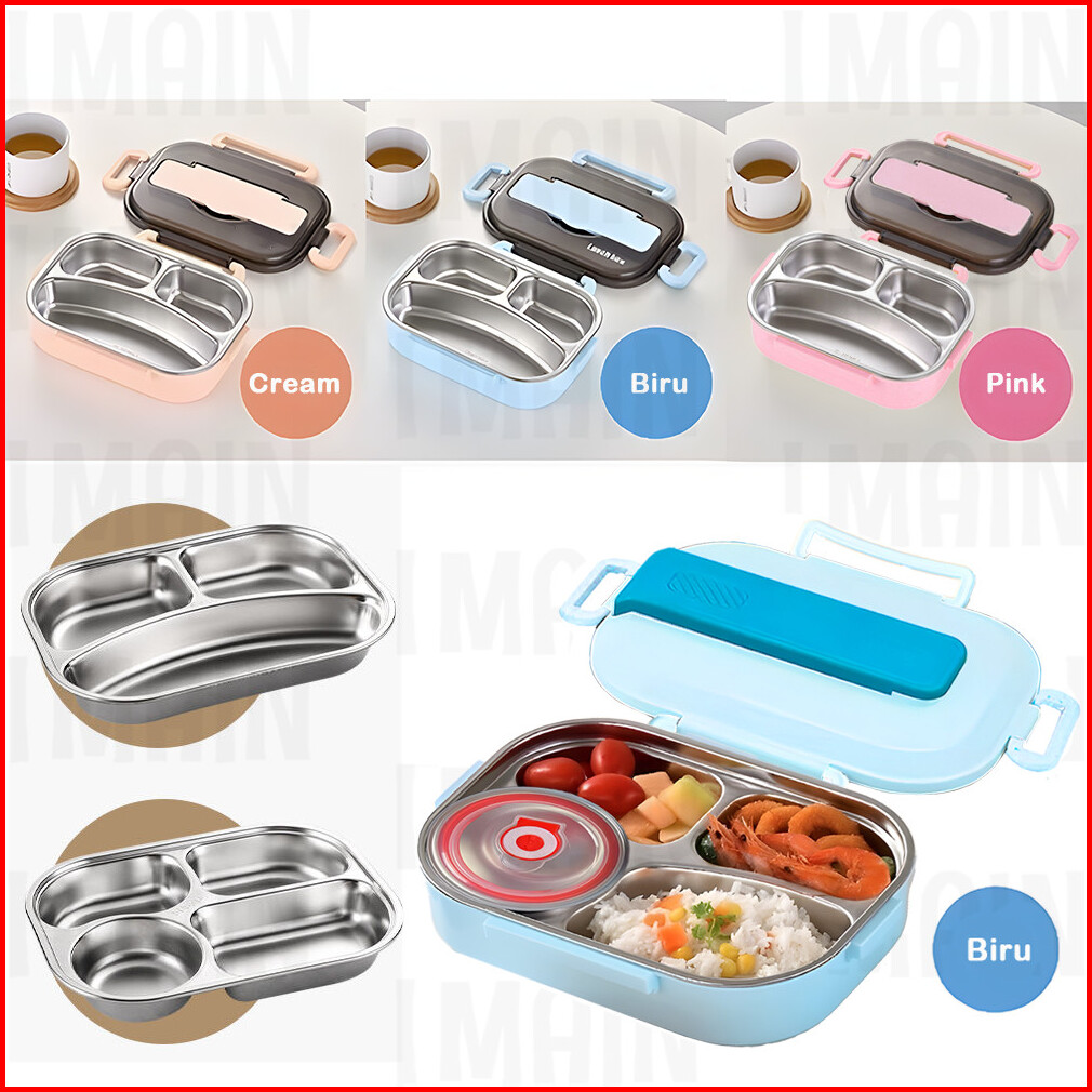 Kotak Makan Stainless Sekat 4 Lunch Box 4 Sekat Baja Tahan Karat Tempat Makan 4 Sekat 1500ml Lengkap Sendok Garpu