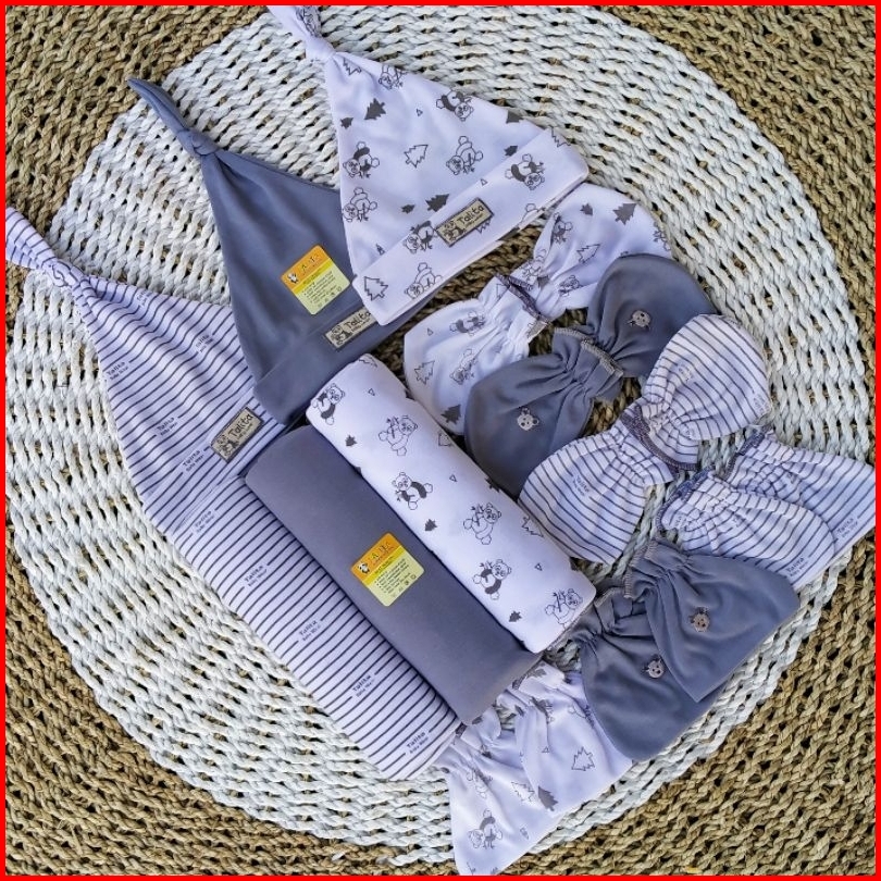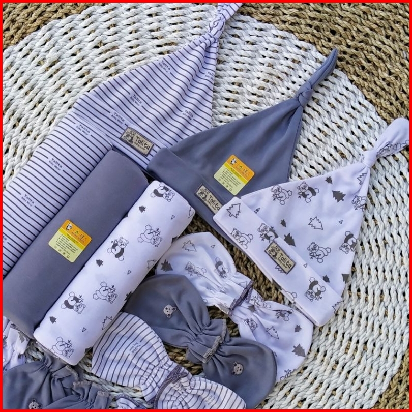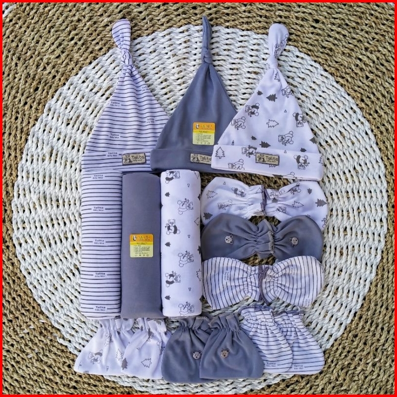 Paket Hemat 12 Pcs Bedong Set Topi Sarung Tangan Kaki Bayi Baru Lahir Newborn Seri Abu Talitababywear