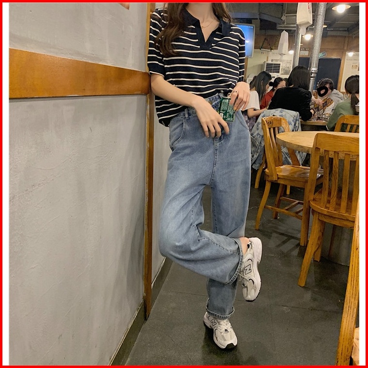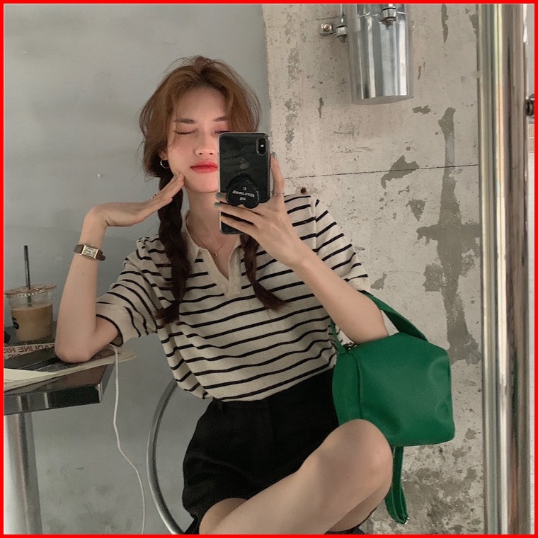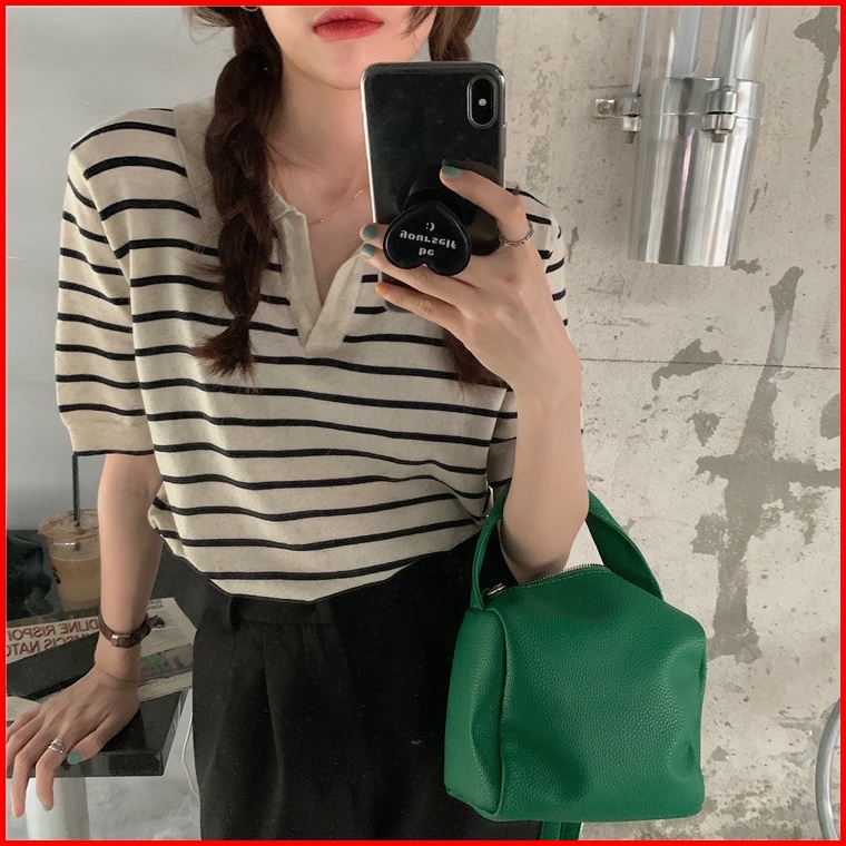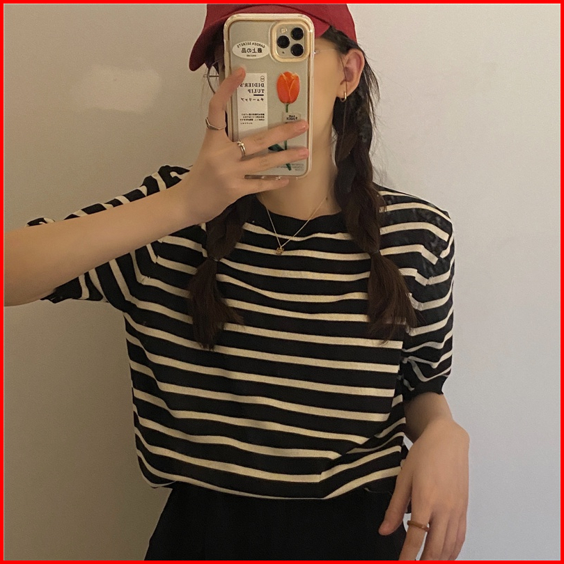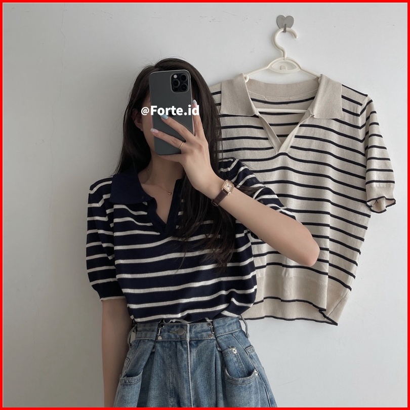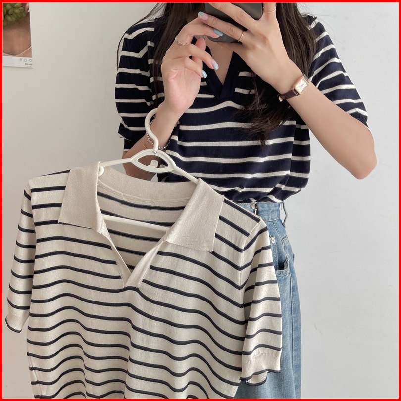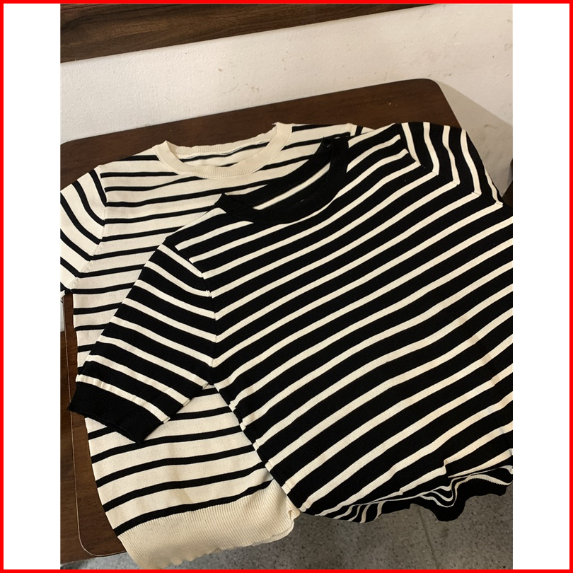 Kaos Rajut Wanita Atasan Rajut Lengan Pendek Korean Retro Style Kasual Knit Stripe T-shirt