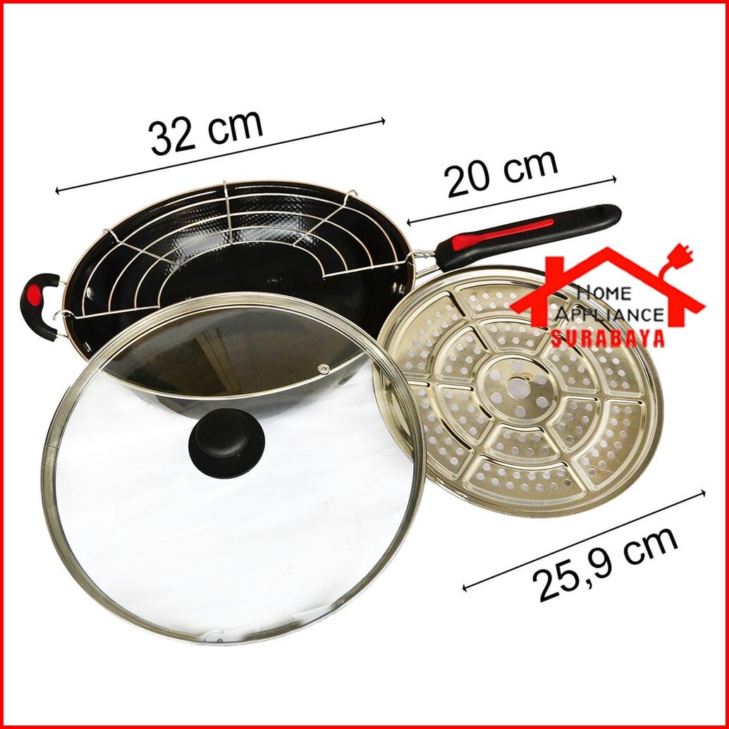 Panci Wajan Goreng Anti Lengket Tutup Kaca Tirisan Minyak Saringan Pengukus 32 Cm Gsf G 1132 Ksg