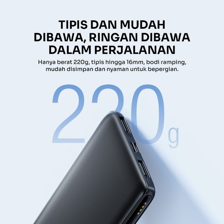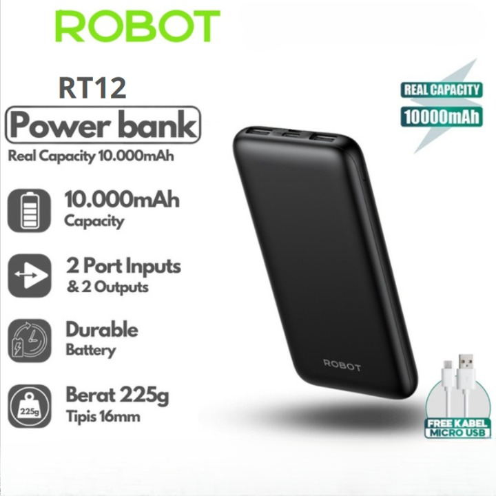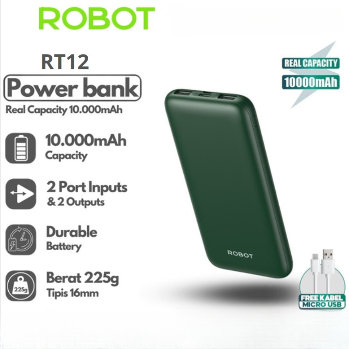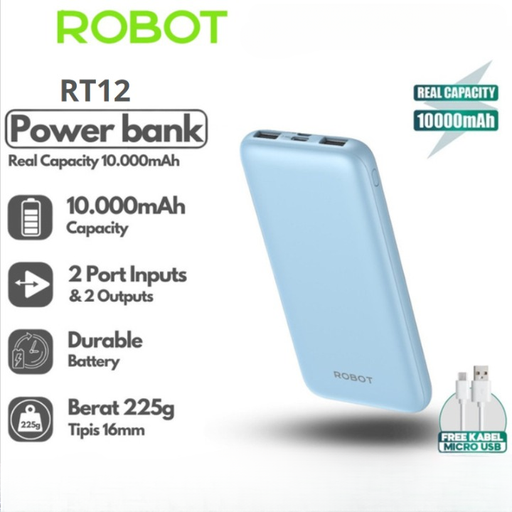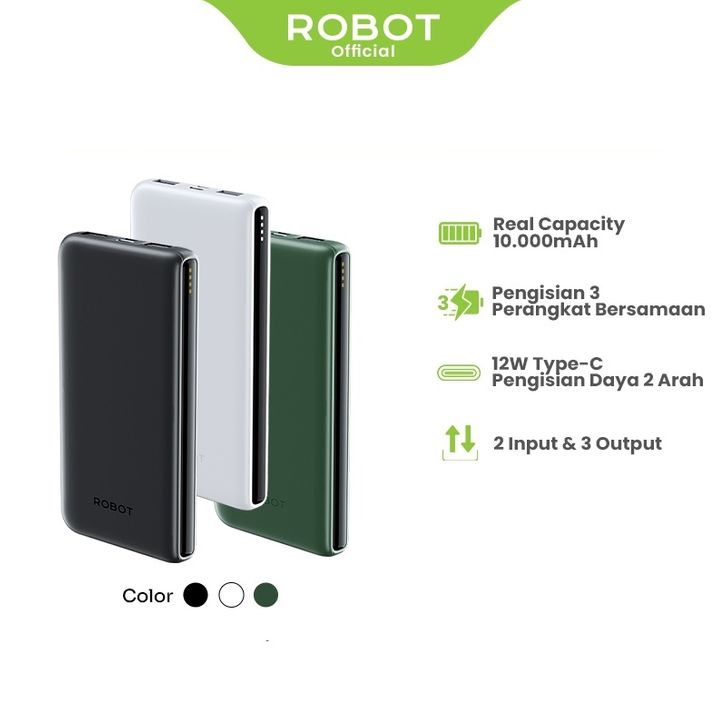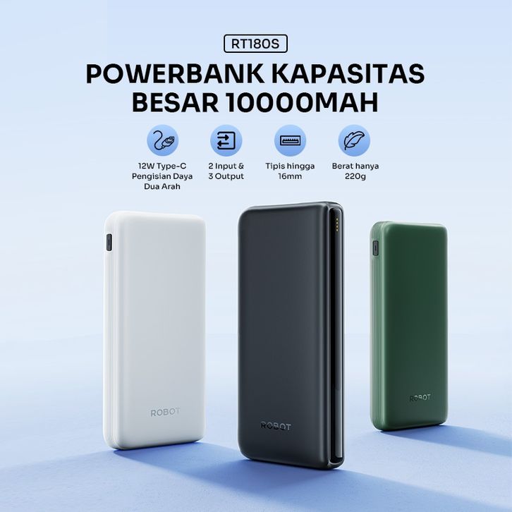 Powerbank ROBOT RT180S 10000mAh RT12 Dual Input Output 12W Type-C Slim dan Ringan 16mm Bisa Cas 3 Perangkat