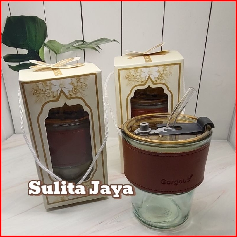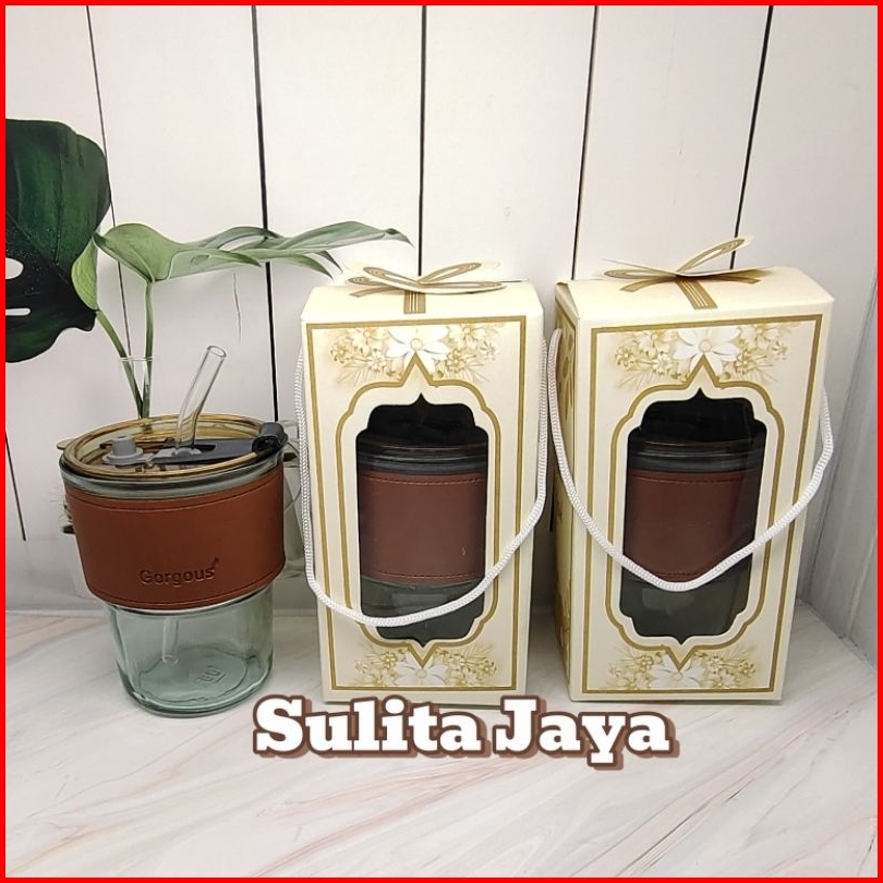 Isi 6 Pcs - Souvenir Pernikahan Gelas Mug Souvenir Botol Minum Sedotan Kaca 420ml Kemasan Box Motif Tali