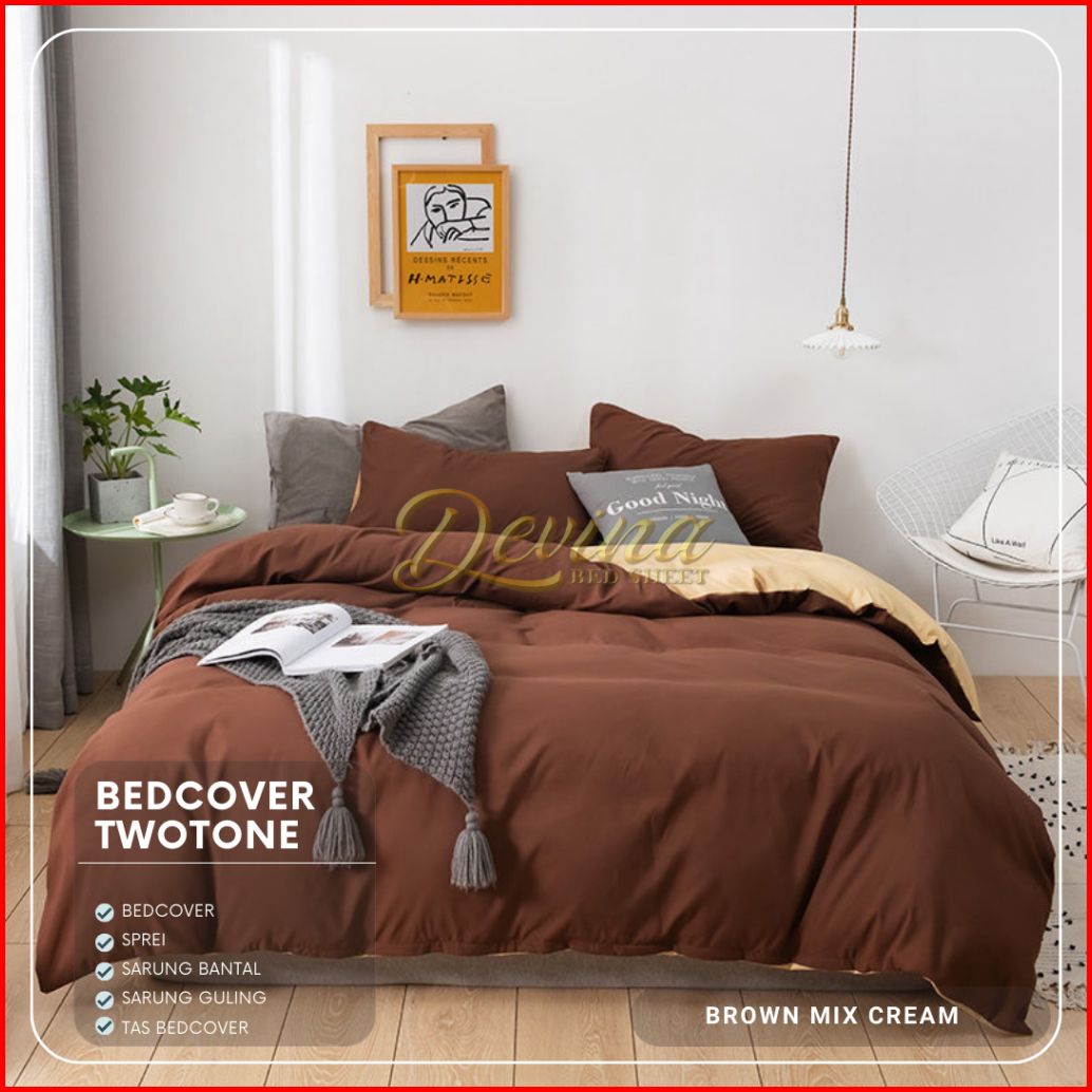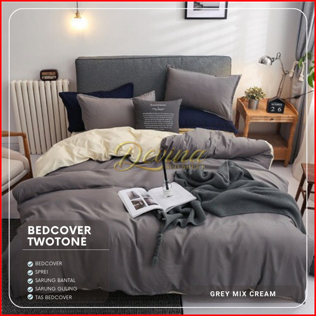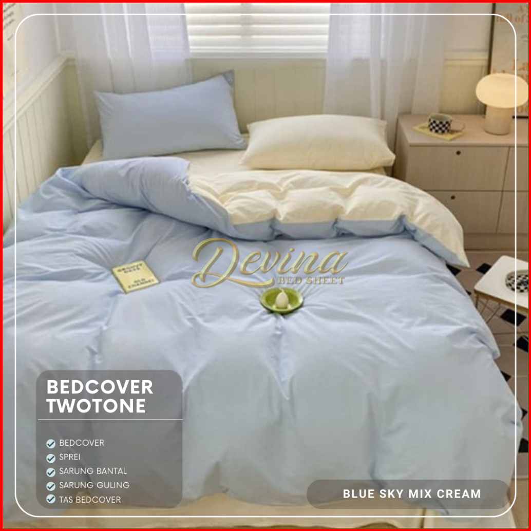 Bedcover Set Two Tone Polos Selimut Bolak Balik Kombinasi Dua Warna Cream Mix Sky Blue Aesthetic Soft Color Katun Premiu