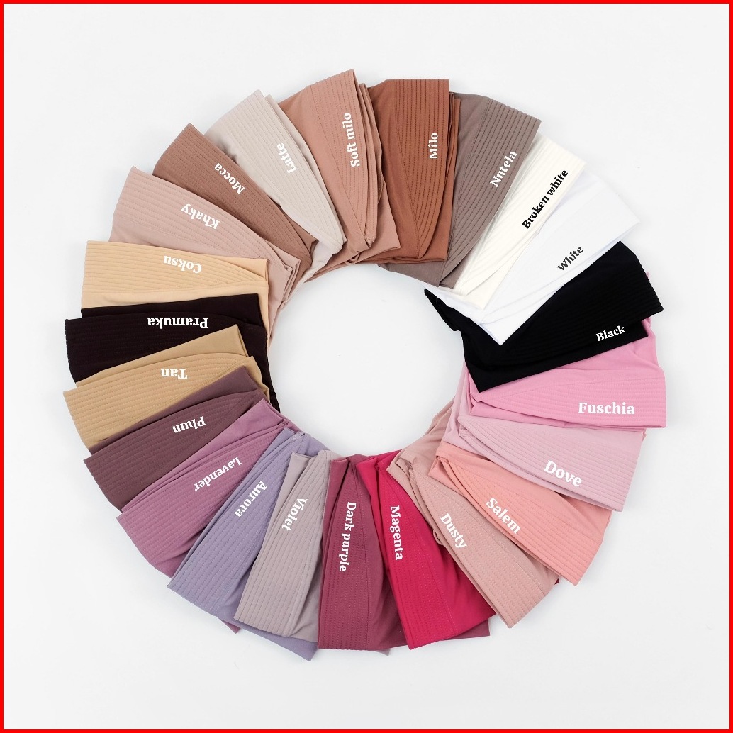Black, white, Broken white, nutella, Milo, softmilo, latte, Khaky, Coklat pramuka, Coksu, Tan, Plum, Lavender, Aurora, Dark purple, Magenta, dusty, salem, Dove, Fuschia, Grey, Darkgrey, Navy, Denim, Biru elektrik, Burgundy, Maroon, Chili, Merah hati, Mustard, lemon, Teracotta, Sage, Olive, Zaitun, Army, Tosca, Turkish blue, Wardah, Hijau bottle, Hijau lumut