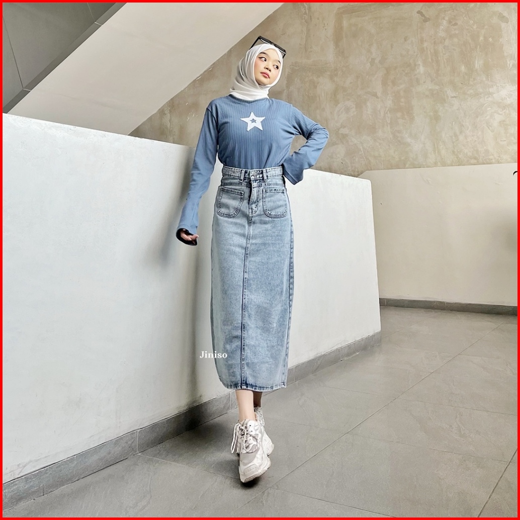 Jiniso - Highwaist Pocket Rok Slit Jeans Panjang 932 Seventy