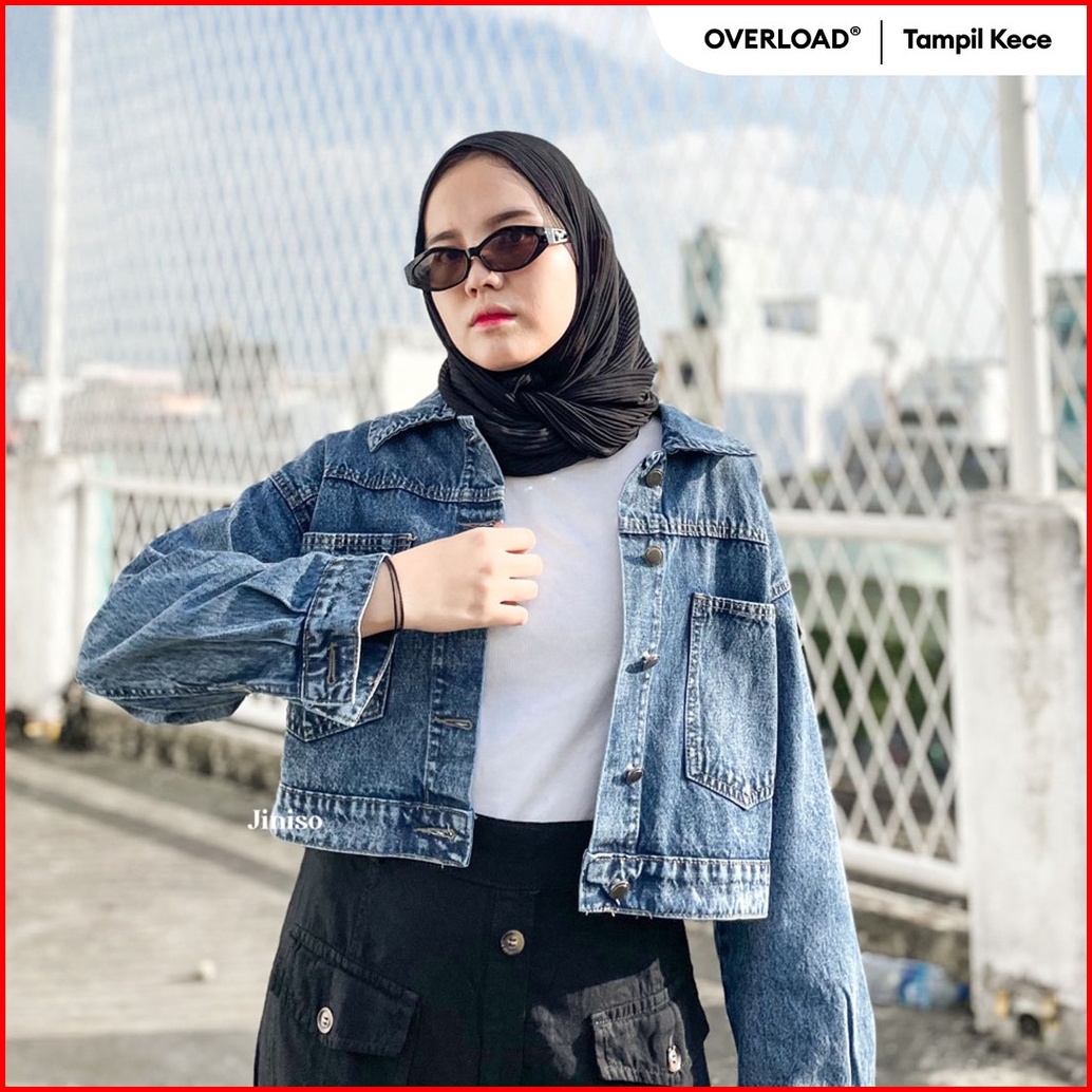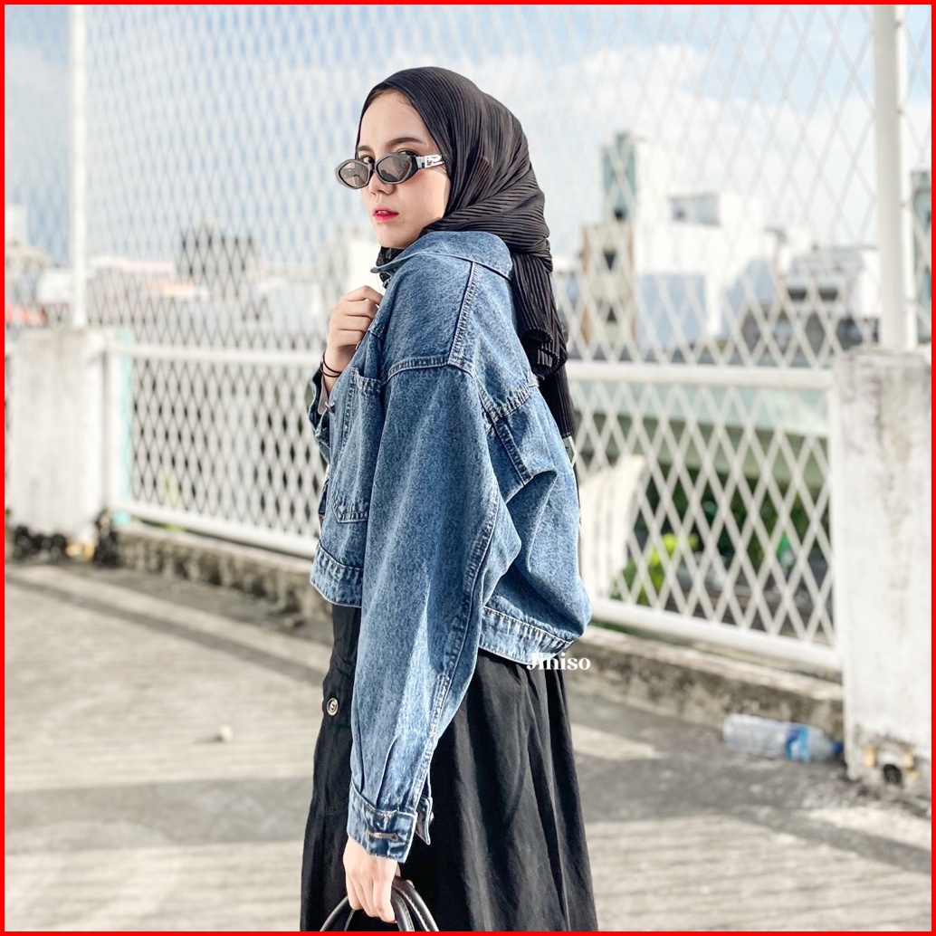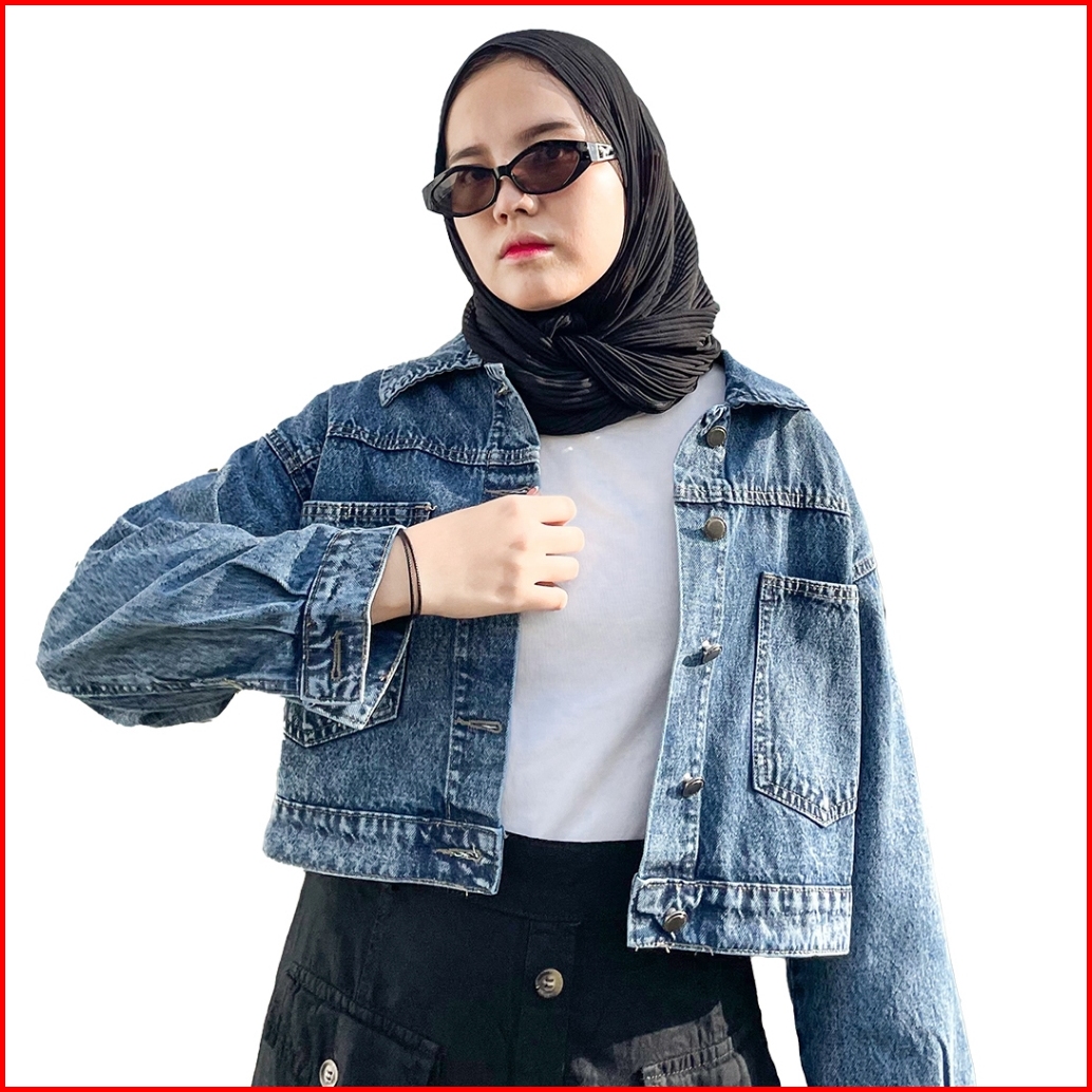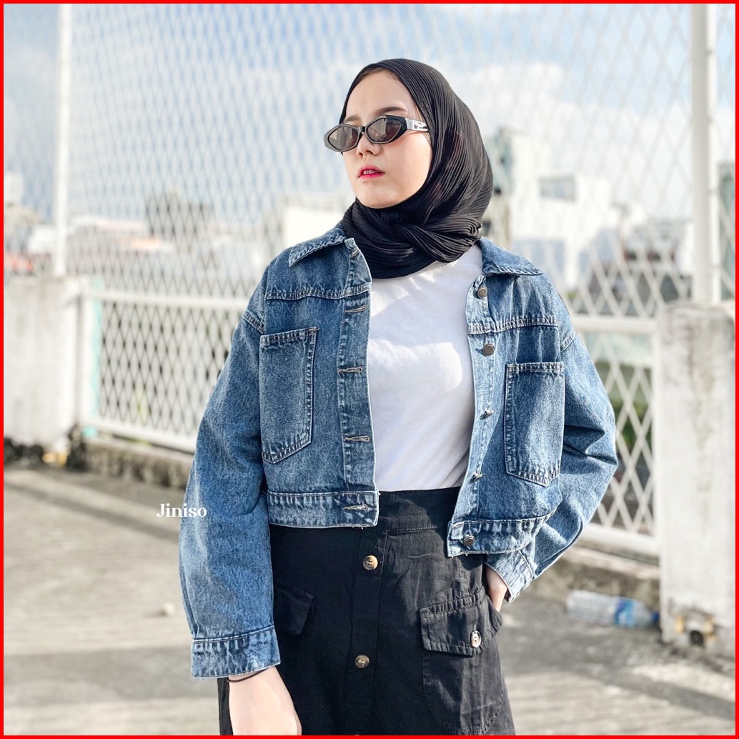Jiniso Jaket Crop Jeans Oversize Pocket Blue Acid