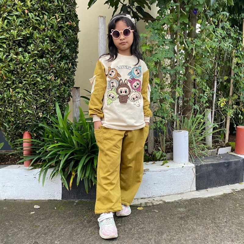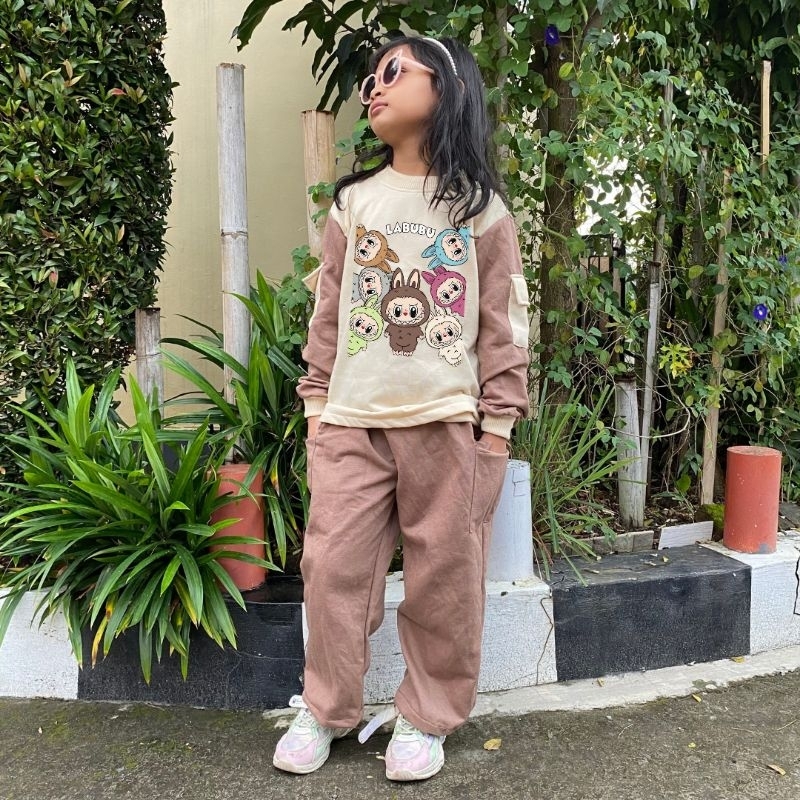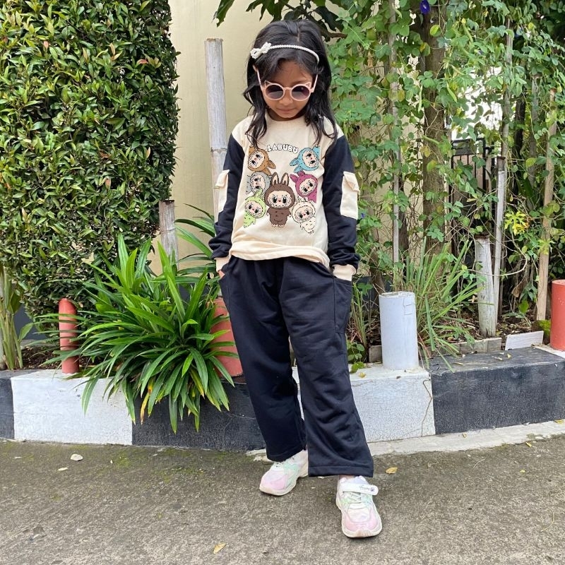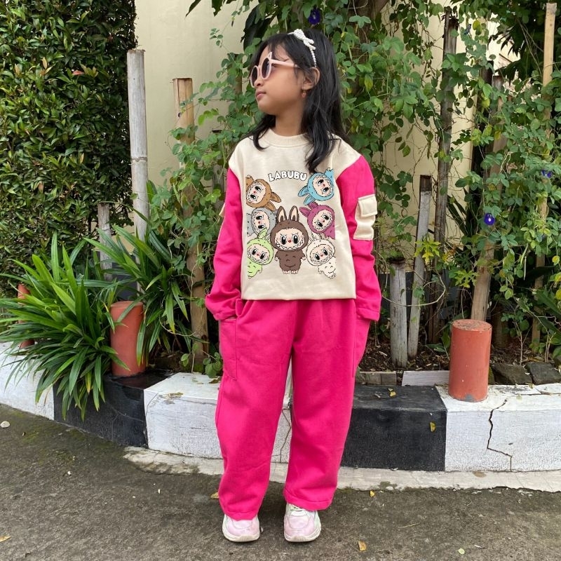 SETELAN ANAK PEREMPUAN LABUBU VIRAL SET CARGO FLEECE USIA 3-12 TAHUN
