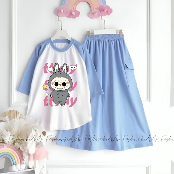 Set Rok Anak LABUBU TTINNY Setelan Anak Perempuan 3-12 Tahun Setelan Anak Cewek Viral Crinkle Airflow Setelan Baju Anak