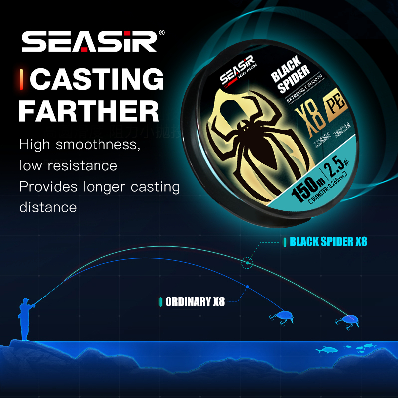 [OFFICIAL] SEASIR Black Spider PE X8 Senar Pancing (150 Meter, 7.5kg-21kg) P-Series Pancing PE Braided Fishing Line Ice Blue 8 Strands Pe Fishing Main Line 150M 16-40Lb Upgrade Japanese Original Line