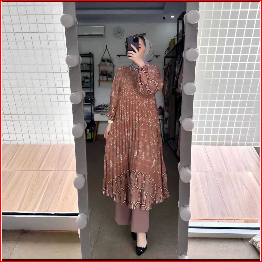 One Set Naila Tunik Plisket - Setelan Long Tunik Plisket Motif New Celana Crinkle Premium - One Set Wanita Terbaru