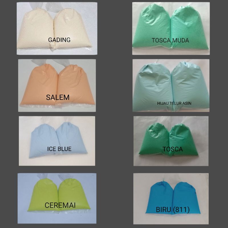 Hijau 817, Hijau melon, Hijau stabilo, Avocado, Ceremai, Caroline, Tosca muda, Tosca, Orange, Sanset, Kuning mustard, Kuning terang, Abu gelap, Abu tua, Abu muda, Kuning kunyit, Biru persib, Biru langit, Ice blue, Ungu tua, Biru 811, Biru doraemon, Hijau telur asin, Ungu muda, Hitam, Fresh pink, Rose white, Pink, Cream, Gading, Durian, Merah bata, Coklat, Moca, Army, Hijau kiwi, Putih, Salem, Biscuit, Coklat sedang, Putih tulang