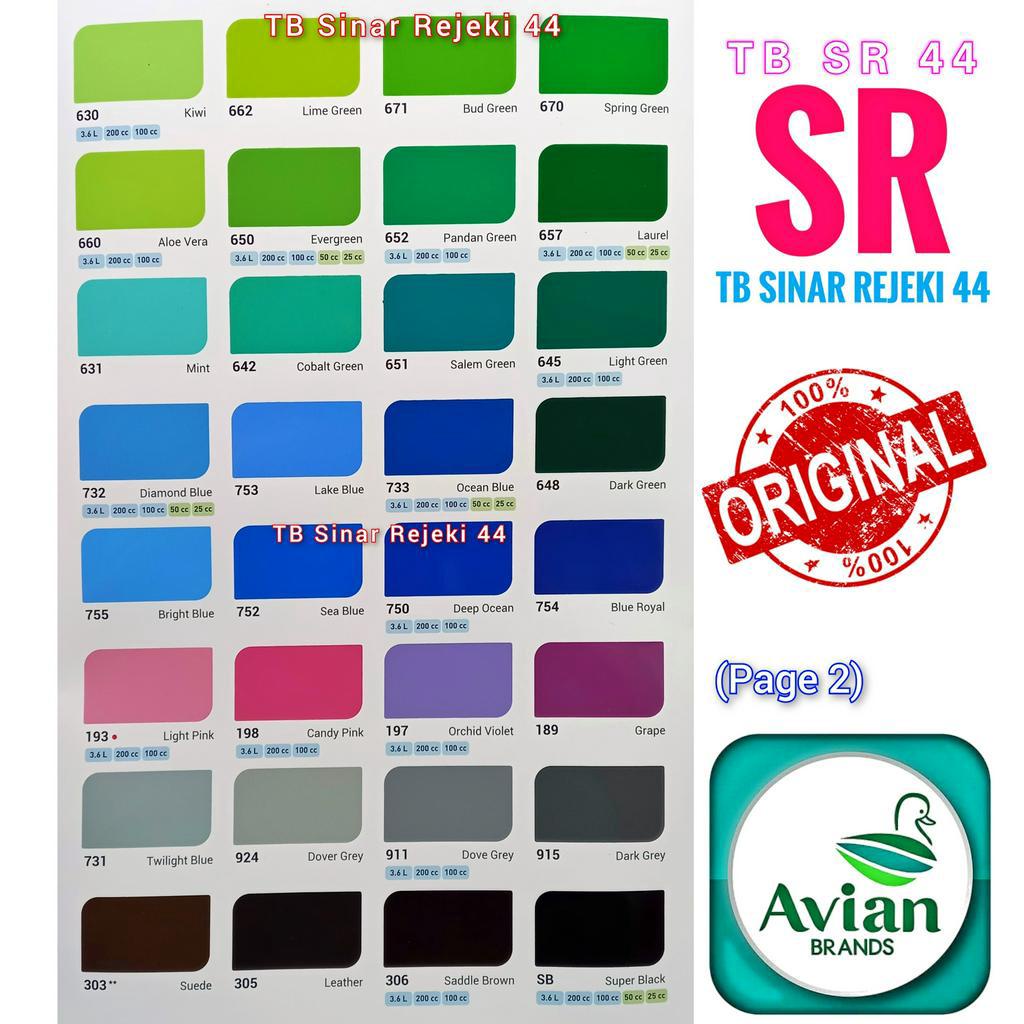 SW SUPER WHITE KILAP, SWM SUPER WHITE MATT, SB SUPER BLACK KILAP, SBM SUPER BLACK MATT, 110 Natural White, 370 Broken White, 461 Pearl White, 462 Lunar Cream, 466 Golden Yellow, 199 Sunkist, 470 Banana, 480 Lemonade, 465 Medium Yellow, 179 Pumpkin Orange, 160 Carrot, 190 Flame Orange, 178 Chile Red, 192 Vermillion, 191 Sunrise, 310 Mocha, 334 Light Mahogany, 194 Maroon, 329 Golden Brown, 330 Copra Brown, 331 Mahogany Brown, 328 Golden Honey, 333 Caramel Apple, 301 Candy Brown, 309 Cinnamon, 630 Kiwi, 662 Lime Green, 671 Bud Green, 670 Spring Green, 660 Aloe Vera, 650 Evergreen, 652 Pandan Green, 657 Laurel, 631 Mint, 642 Cobalt Green, 651 Salem Green, 645 Light Green, 732 Diamond Blue, 753 Lake Blue, 733 Ocean Blue, 648 Dark Green, 755 Bright Blue, 752 Sea Blue, 750 Deep Ocean, 754 Blue Royal, 198 Candy Pink, 197 Orchid Violet, 189 Grape, 731 Twilight Blue, 924 Dover Grey, 911 Dove Grey, 915 Dark Grey, 303 Suede, 305 Leather, 306 Saddle Brown, 661 Spring Garden**, VERNISH CLEAR BENING